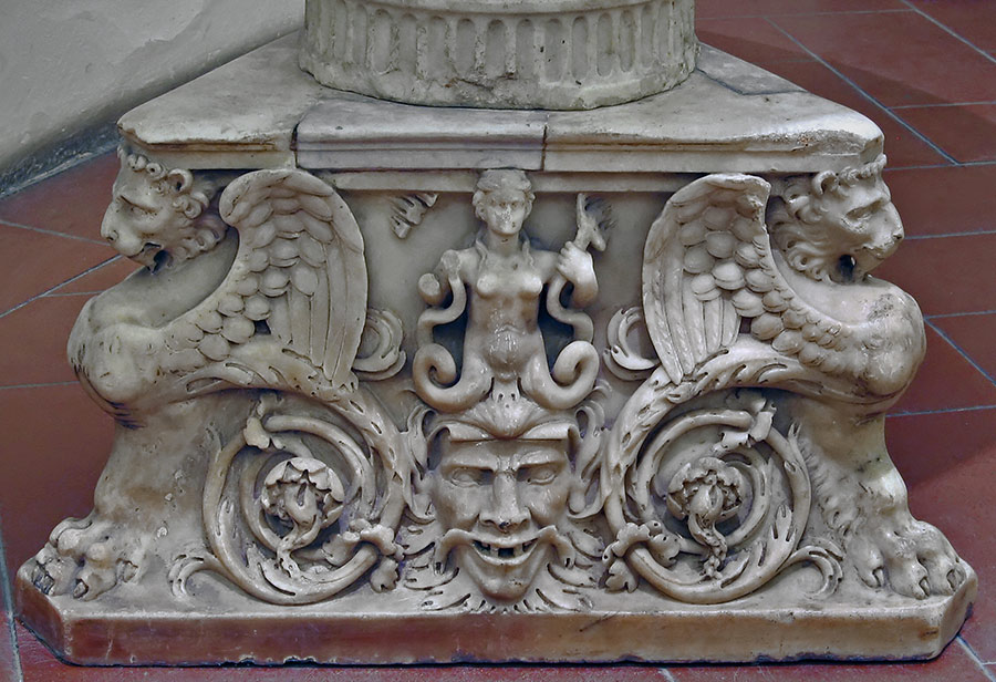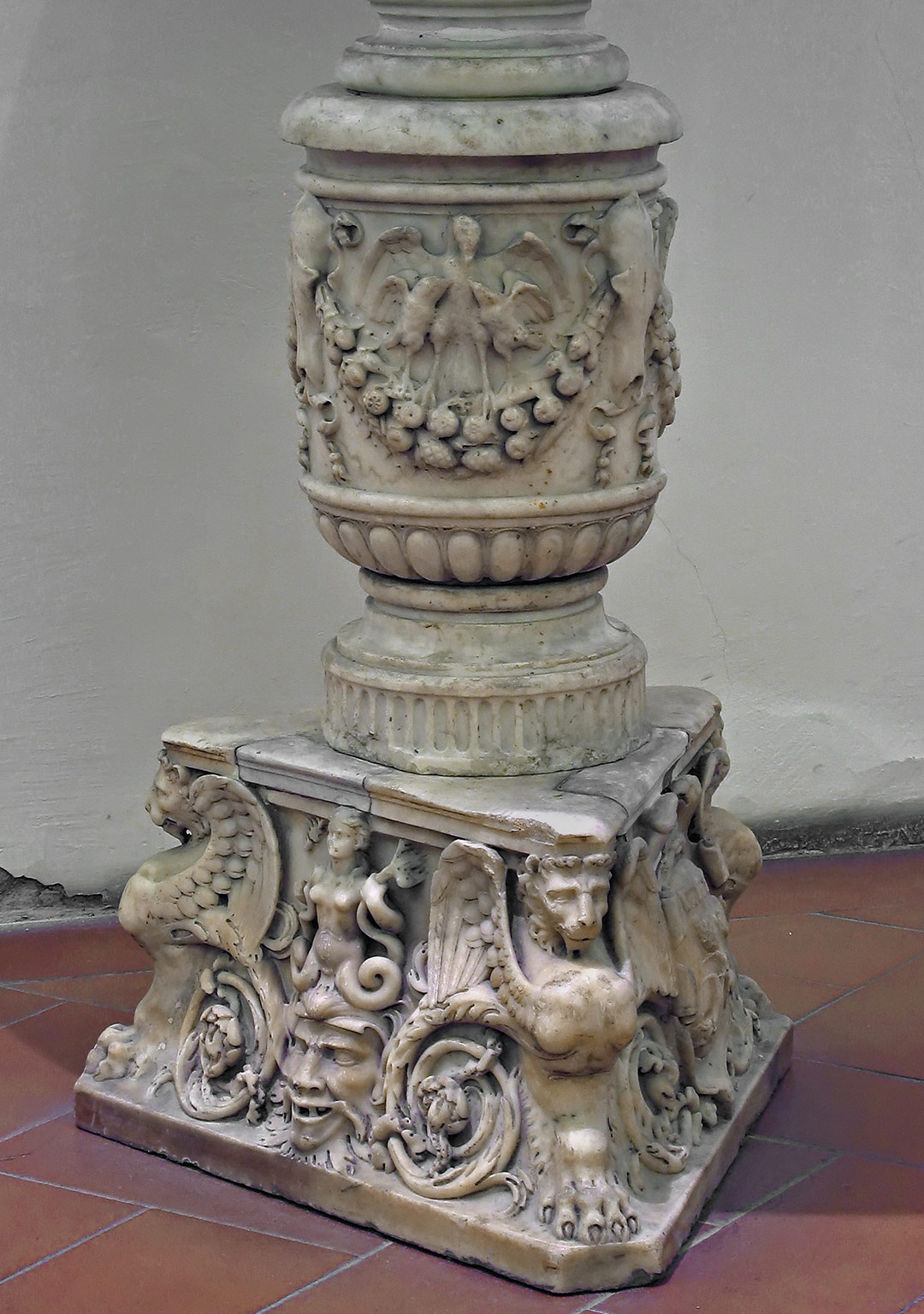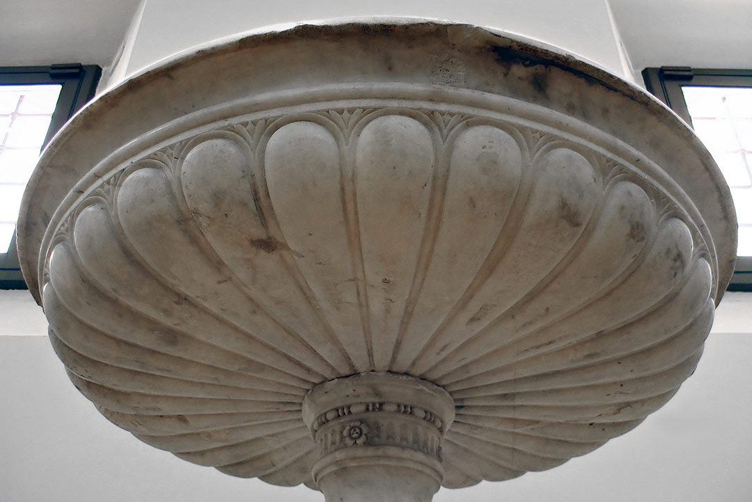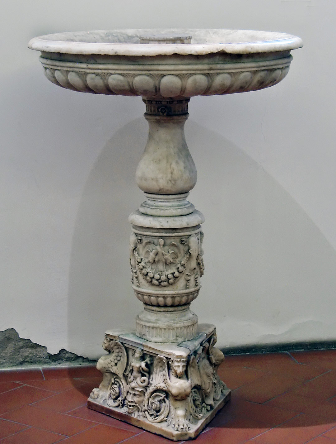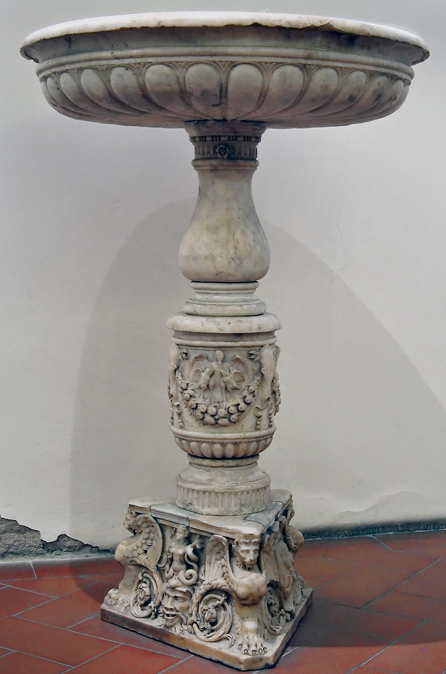 La datazione dell’oggetto e la sua committenza compaiono nella cartella del basamento, dalla quale si apprende che l’empolese Giovanni di Andrea Zucherini aveva affidato l’esecuzione a Battista di Donato Benti, come documentato anche da carte d’archivio. La struttura dell’acquasantiera riprende modelli attestati nella plastica fiorentina tra la fine del Quattro e la prima metà del Cinquecento, nella bottega di Benedetto da Rovezzano. Sulla base a tronco di piramide, recante agli angoli arpie dalle teste leonine e al centro mascheroni, si eleva il fusto, ornato al centro da festoni retti da bucrani e abitati da uccelli. La conca è intagliata con motivi a baccellatura. Le decorazioni attingono largamente al repertorio classico, reinterpretato con nuova sensibilità sin dal secolo precedente: così, se le arpie si ispirano ancora a modelli di Donatello, i capricciosi mascheroni discendono dal repertorio michelangiolesco della Sagrestia Nuova.