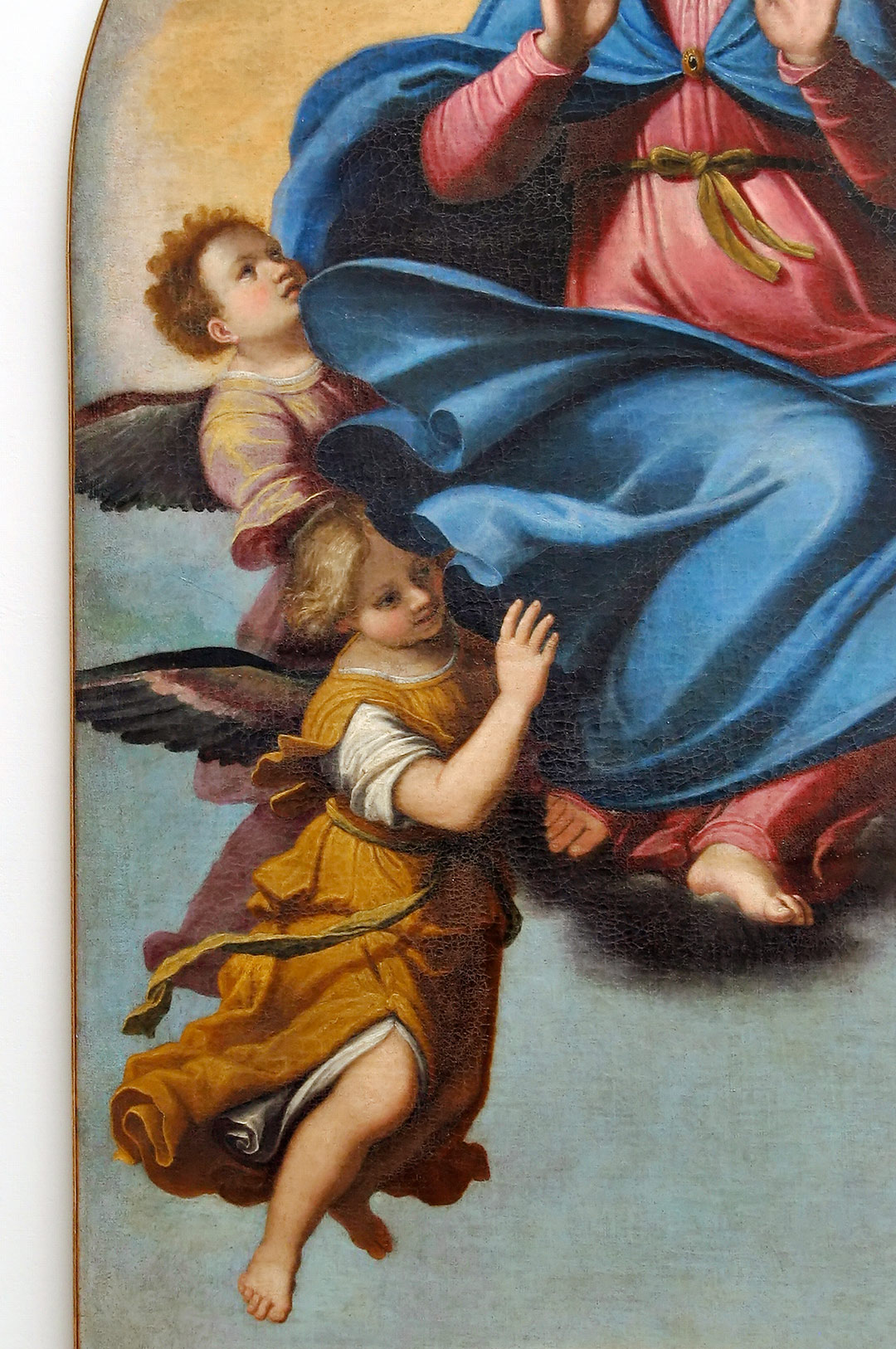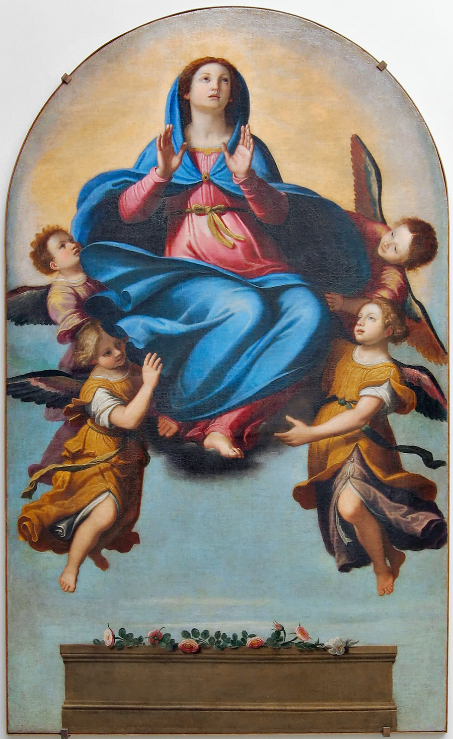 L’Assunta ripropone una soluzione già sperimentata dal pittore nella tavola di eguale soggetto, firmata e datata 1610, per la pieve di Sant’Andrea a Montecarlo (Lucca). Pur ridotta nel formato e nel numero di personaggi, l’opera di Empoli si impone per la resa tornita dei volumi e per la lucidissima impostazione spaziale del leggero sottinsù del sepolcro della Vergine, che suggerisce un’ideale continuità tra quella pietra, dipinta, e il grado reale dell’altare su cui la pala poggiava.