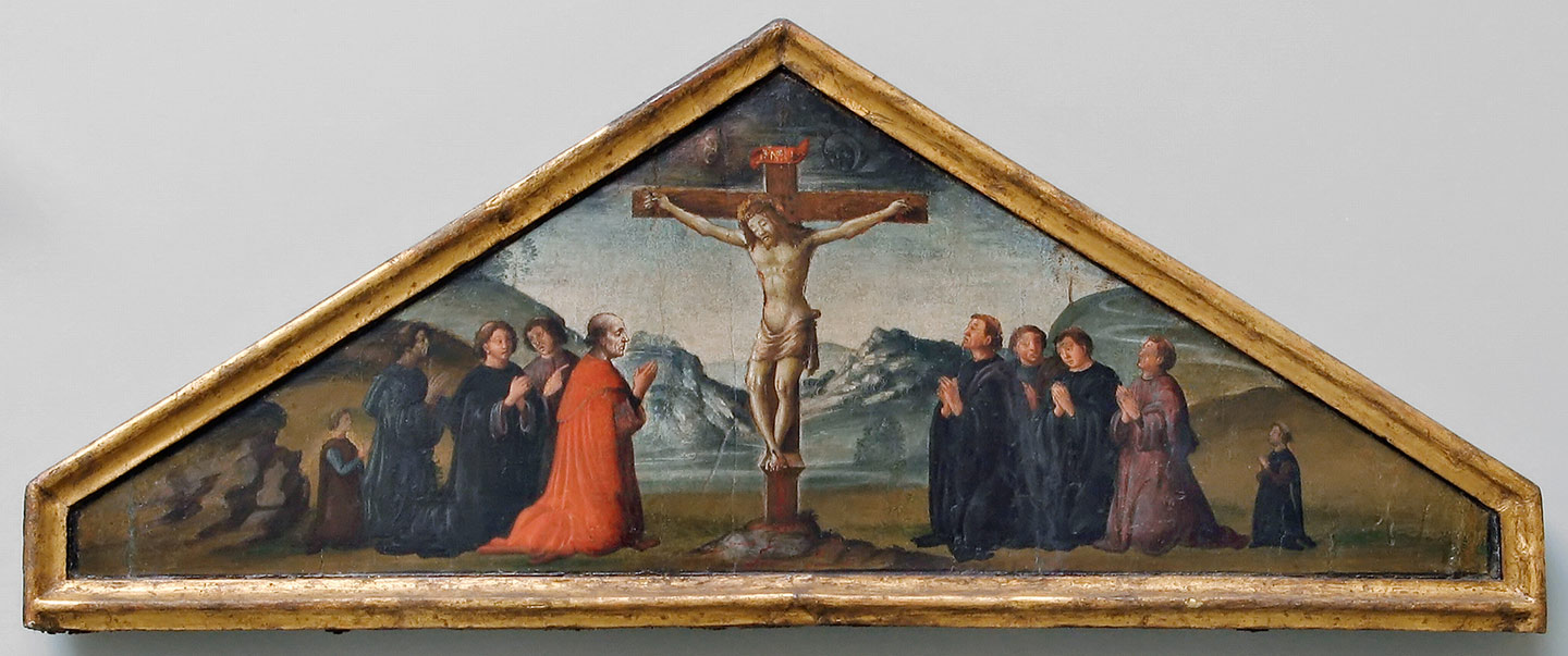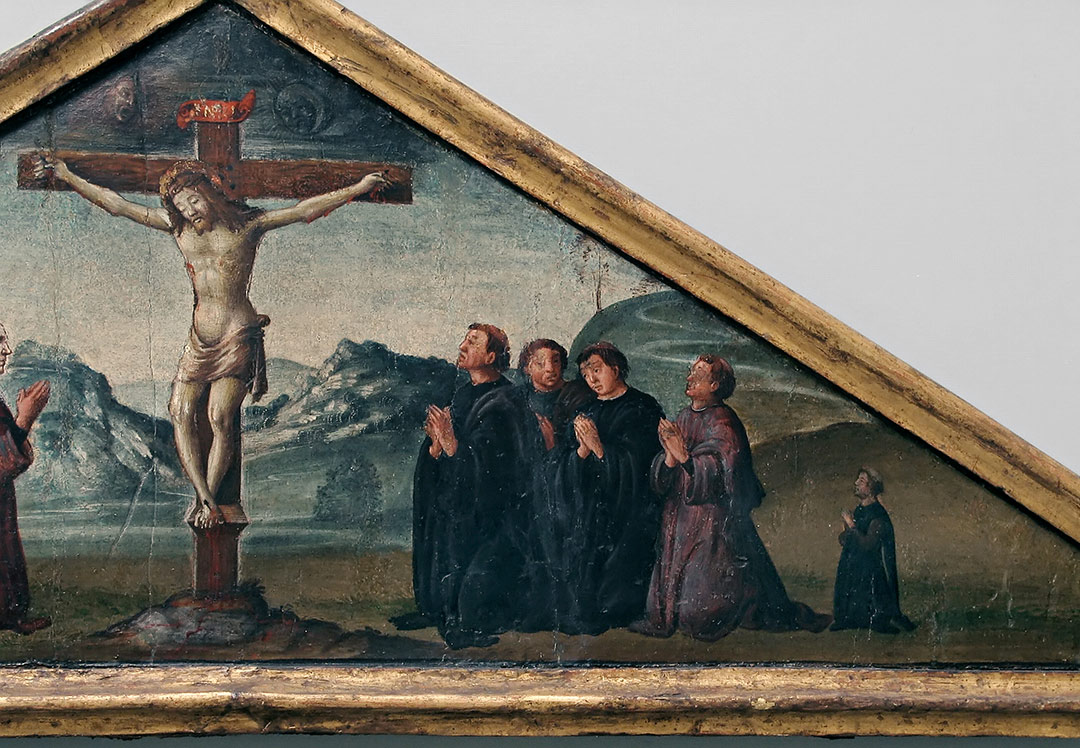 Il formato triangolare di questa piccola tavola indica che la sua collocazione originaria doveva essere alla sommità di una piccola pala d’altare. Vi figura, in primo piano, un gruppo di monaci, forse Agostiniani, in adorazione del Crocifisso; sullo sfondo si apre in profondità un limpido paesaggio.