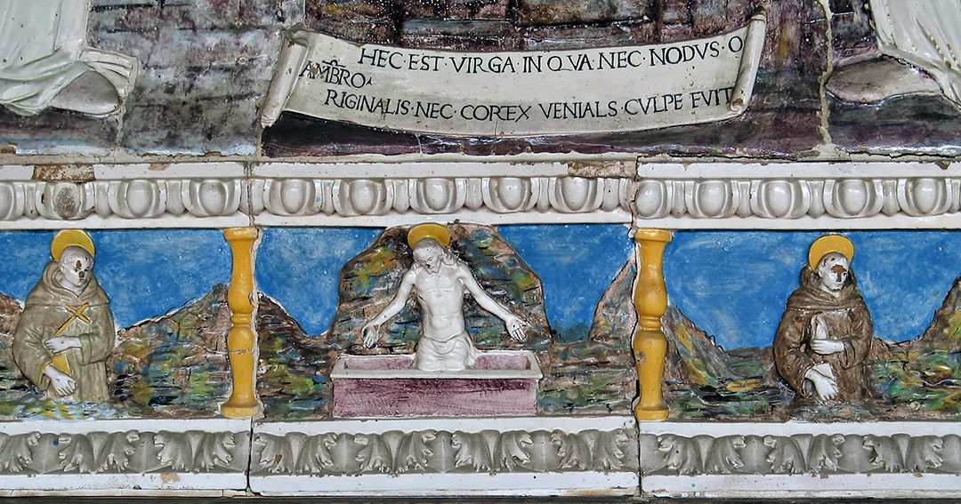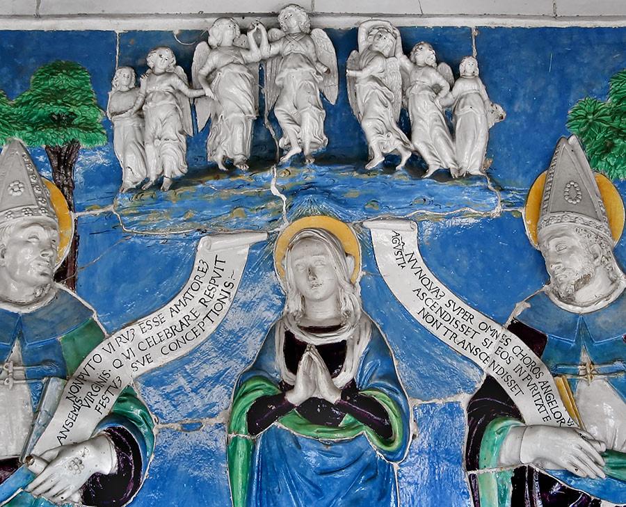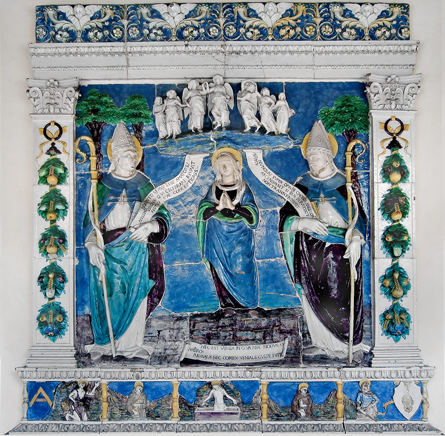 Come rivela il formato, questo rilievo ha i caratteri di una pala d’altare dipinta tradotti in terracotta. È piuttosto frequente incontrare prodotti fittili con questa funzione o ad integrazione di arredi complessi formati di materiali diversi, sia per motivi economici (costi più contenuti) sia per motivi di gusto, offrendo la terracotta invetriata particolari qualità di colore e luminosità che a tutti gli effetti potevano sostituire una pittura. La scultura si trovava nella chiesa francescana di Santa Maria a Ripa insieme al Sant’Anselmo in trono che le faceva da pendant, spostato anch’esso in Collegiata alla fine dell’Ottocento. La composizione risponde a un forte intento teologico, sottolineato dai versi iscritti nei cartigli sostenuti dai due santi, celebrativi della purezza della Vergine concepita. I santi raffigurati, anche se non direttamente francescani, come sant’Anselmo vescovo di Lucca, rivestono per l’ordine una notevole importanza anche in relazione alle dispute sulla dottrina della Concezione, a favore della quale si era dichiarato Sisto IV nel 1485 e della quale i francescani erano strenui difensori.