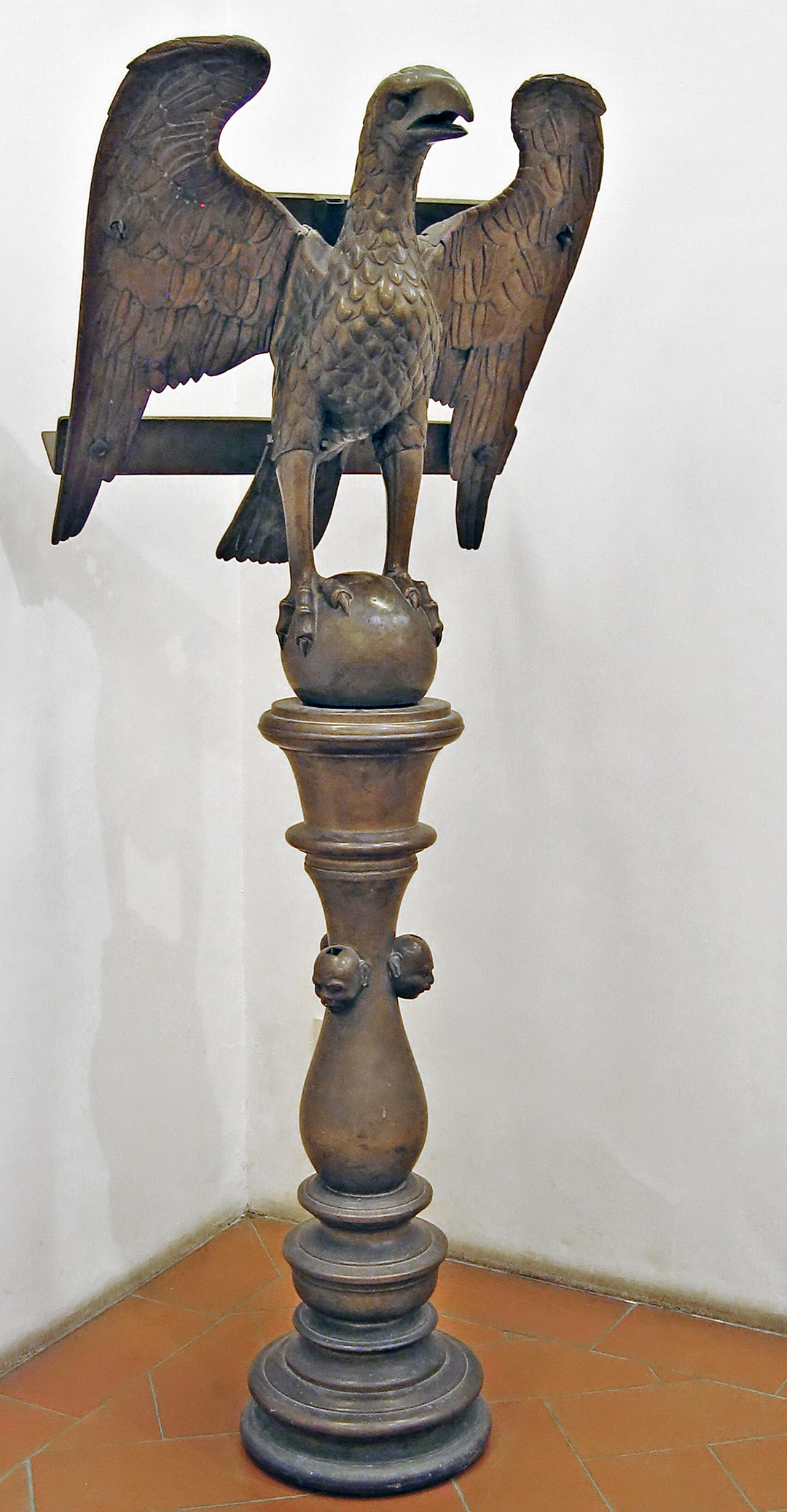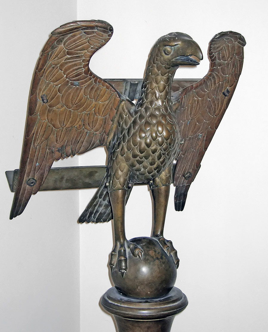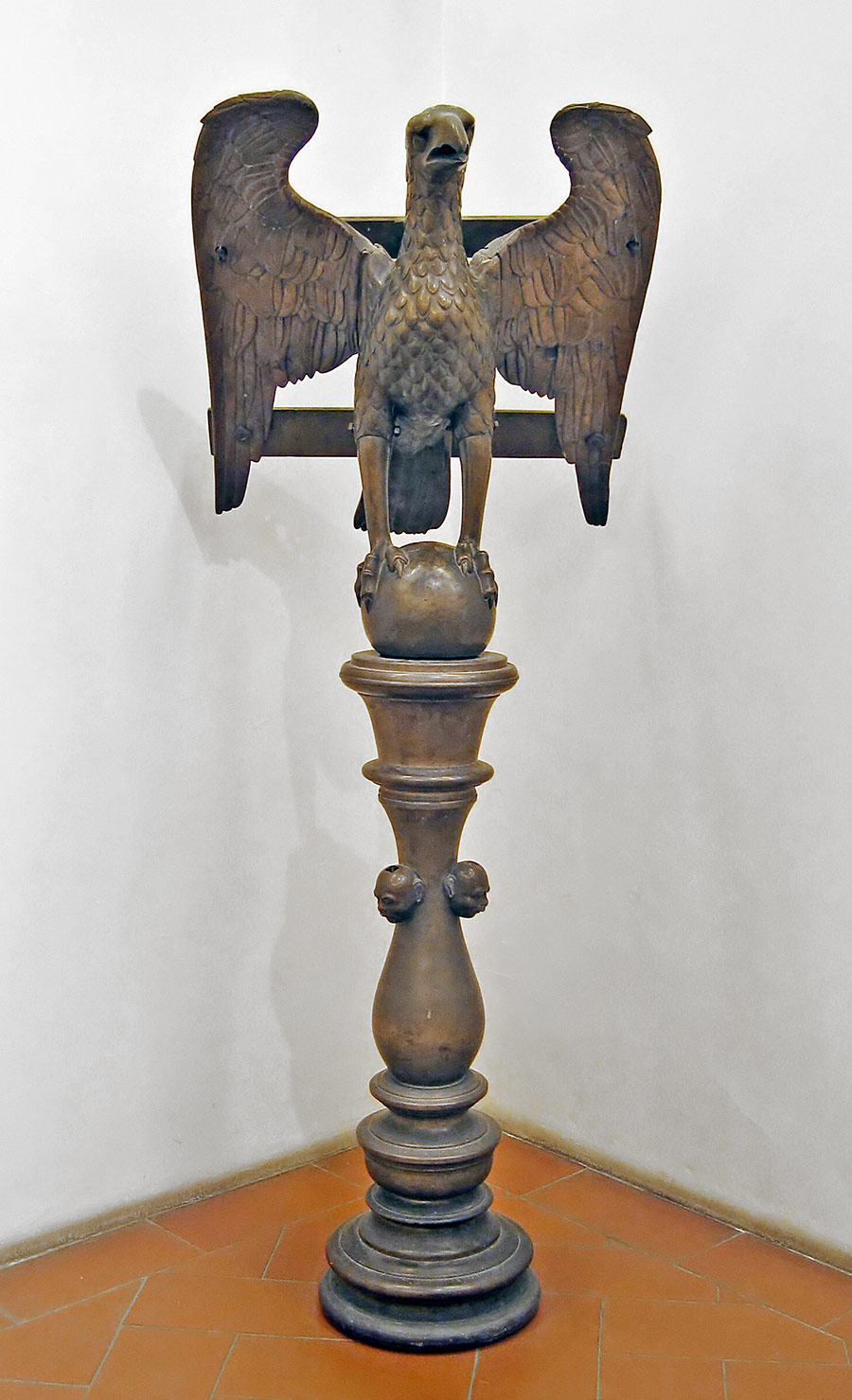 Questo imponente arredo liturgico fa parte del ricchissimo patrimonio di cui disponeva la Collegiata, disperso nel corso del tempo, sia per eventi storici, come il sacco del 1530, che per le trasformazioni intervenute nei secoli XVII e XVIII. Il leggìo, destinato al coro della chiesa, è un raro esemplare di manifattura inglese di cui esistono due prototipi analoghi alla Santissima Annunziata a Firenze. L’iscrizione reca la data 1520 e il nome del canonico Ronconcelli, arcidiacono in Francia nel 1522 e proposto della Collegiata nel 1546.