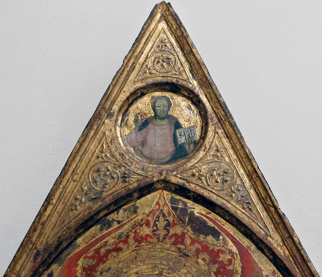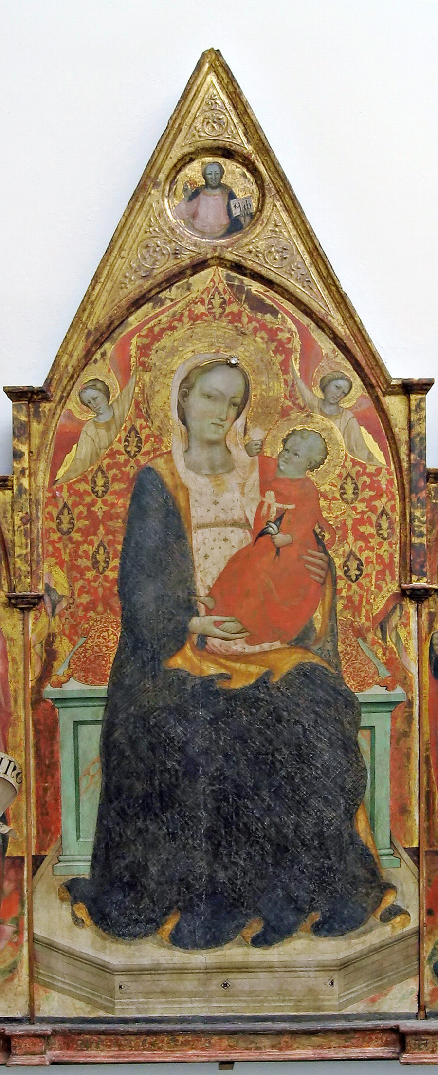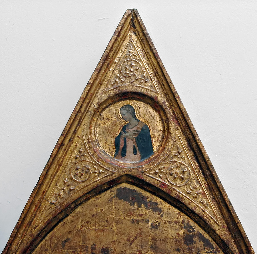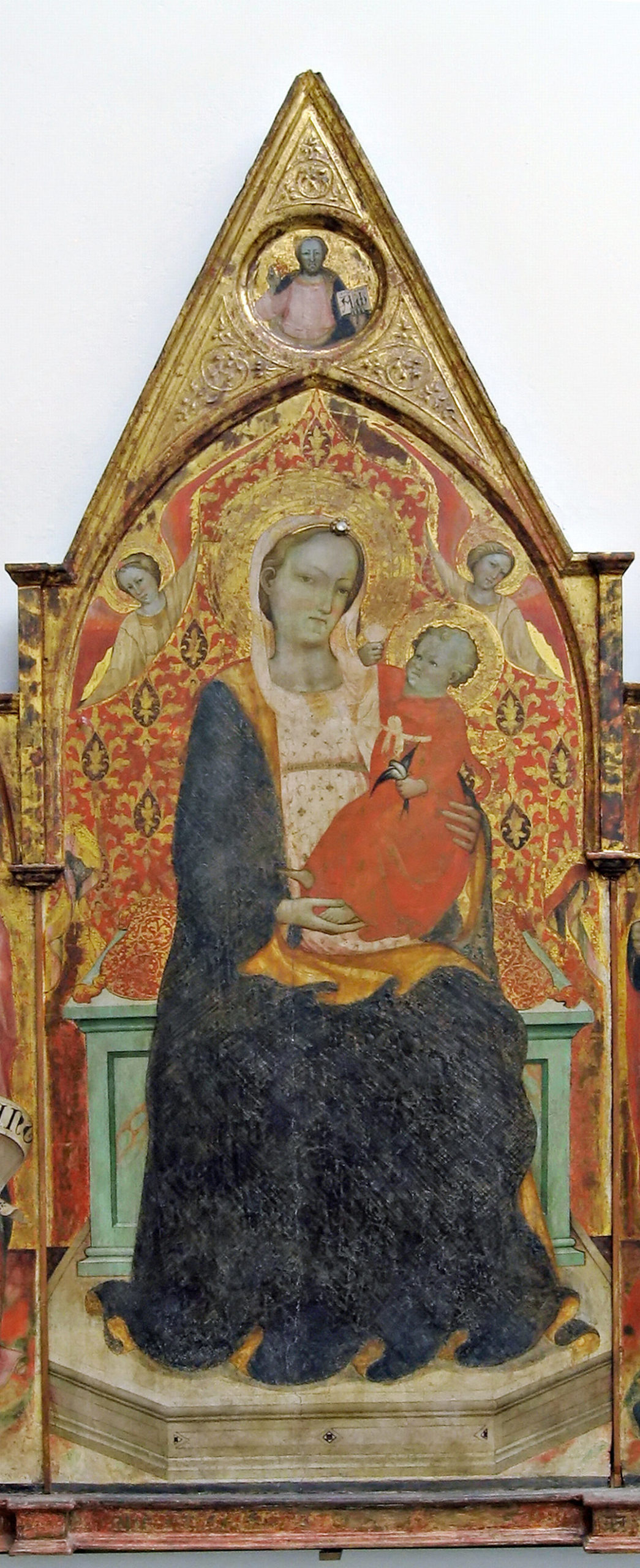 Il polittico è stato attribuito a Rossello di Jacopo Franchi dal Venturi (1911) e dal Berenson (1932). L’opera, proveniente dalla pieve di San Giovanni Battista a Monterappoli, sulle colline che circondano Empoli, presenta numerose lacune nella carpenteria e una superficie pittorica opaca per effetto di robuste puliture subite in passato. Rimangono così in sordina i colori luminosi e squillanti dei manti e del prezioso tendaggio srotolato dagli angeli alle spalle della Vergine, dove i motivi decorativi eseguiti a bulino dovevano risaltare sul fondo rosso restituendo davvero l’effetto tattile di una stoffa pregiata. Rossello di Jacopo Franchi rientra a buon titolo nel novero degli artisti di transizione che, partiti dalla tradizione tardo trecentesca fiorentina capeggiata da Andrea Orcagna, Jacopo di Cione, Agnolo Gaddi, subiscono l’influsso delle novità dello stile internazionale, sull’esempio di Gherardo Starnina e Lorenzo Monaco. Il polittico empolese viene datato generalmente agli anni 1420- 1430 (Paolucci 1985) anche per le strettissime affinità che lo legano a un trittico conservato agli Uffizi e riferibile agli stessi anni.