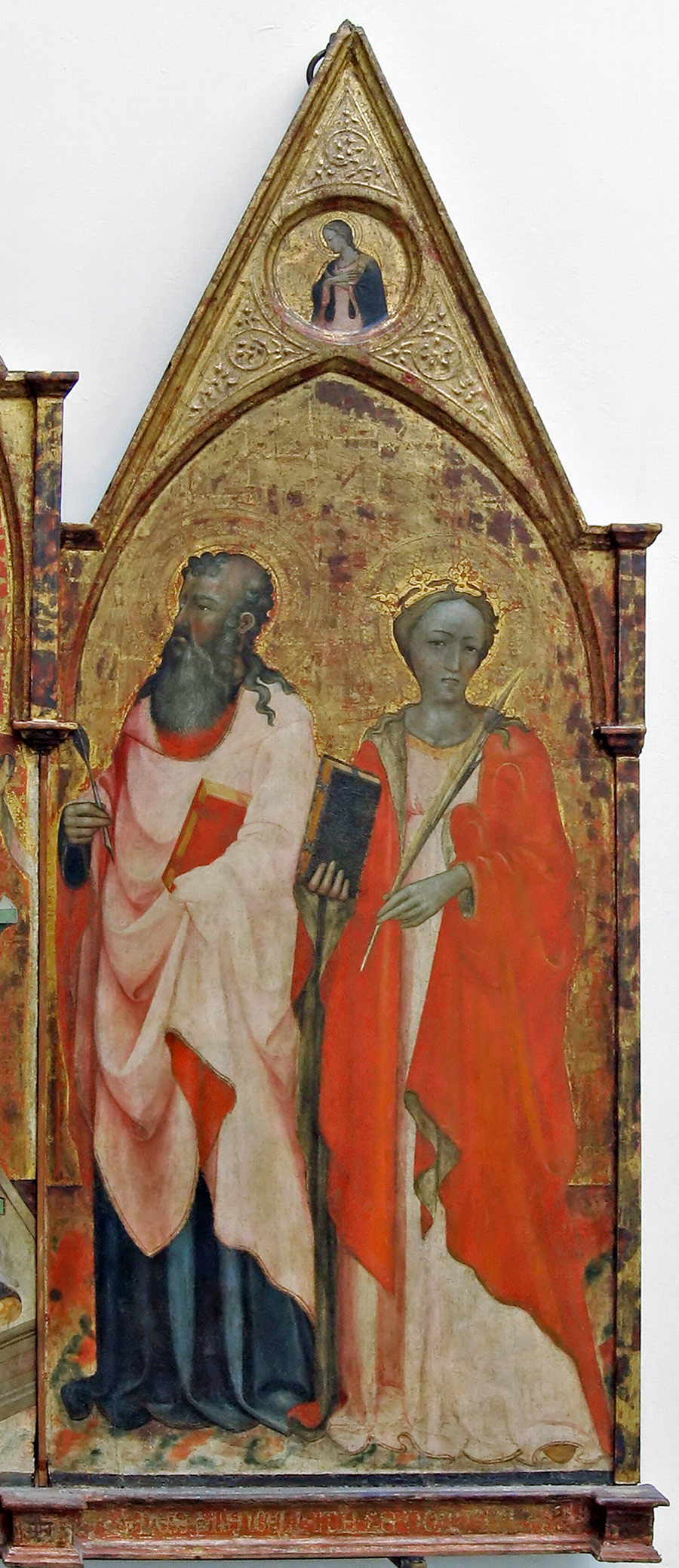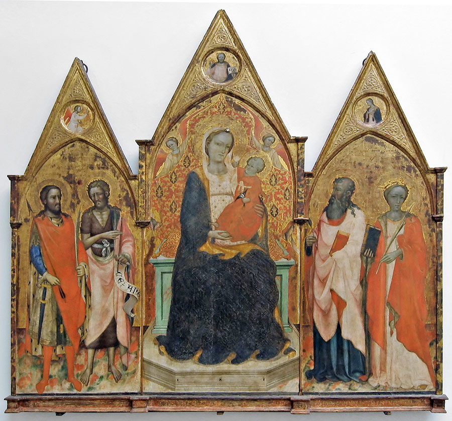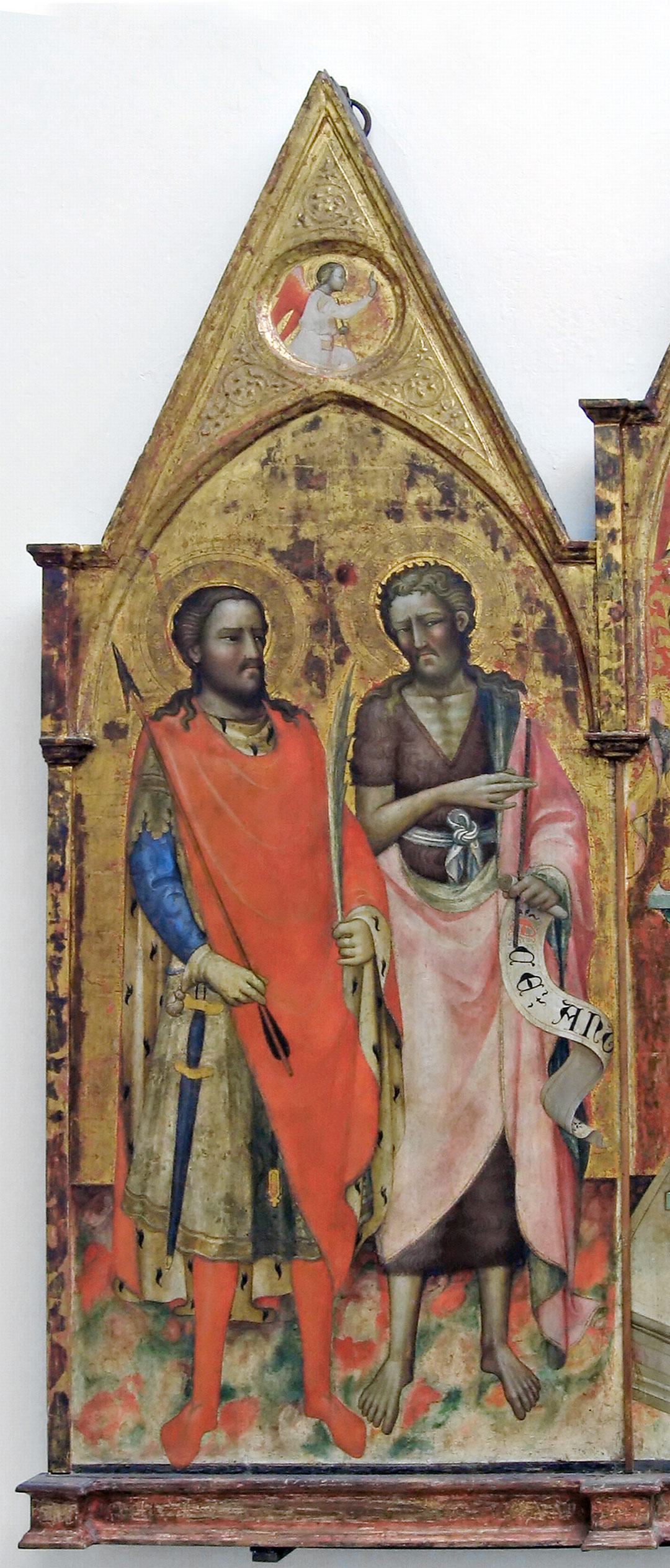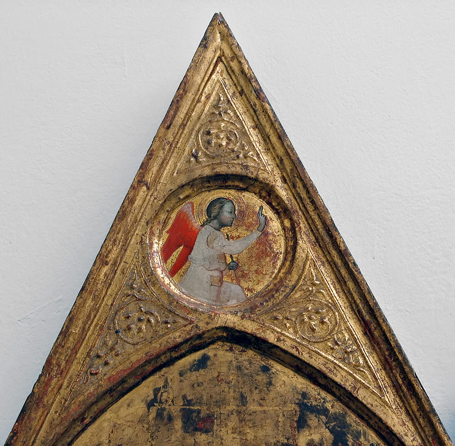 Il polittico è stato attribuito a Rossello di Jacopo Franchi dal Venturi (1911) e dal Berenson (1932). L’opera, proveniente dalla pieve di San Giovanni Battista a Monterappoli, sulle colline che circondano Empoli, presenta numerose lacune nella carpenteria e una superficie pittorica opaca per effetto di robuste puliture subite in passato. Rimangono così in sordina i colori luminosi e squillanti dei manti e del prezioso tendaggio srotolato dagli angeli alle spalle della Vergine, dove i motivi decorativi eseguiti a bulino dovevano risaltare sul fondo rosso restituendo davvero l’effetto tattile di una stoffa pregiata. Rossello di Jacopo Franchi rientra a buon titolo nel novero degli artisti di transizione che, partiti dalla tradizione tardo trecentesca fiorentina capeggiata da Andrea Orcagna, Jacopo di Cione, Agnolo Gaddi, subiscono l’influsso delle novità dello stile internazionale, sull’esempio di Gherardo Starnina e Lorenzo Monaco. Il polittico empolese viene datato generalmente agli anni 1420- 1430 (Paolucci 1985) anche per le strettissime affinità che lo legano a un trittico conservato agli Uffizi e riferibile agli stessi anni.