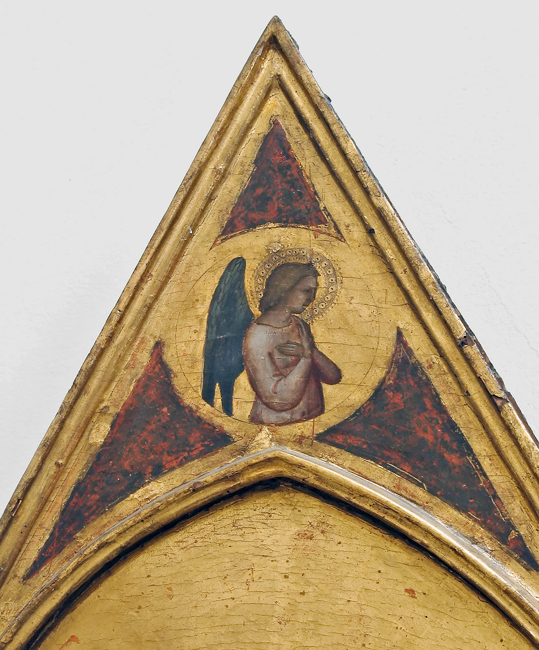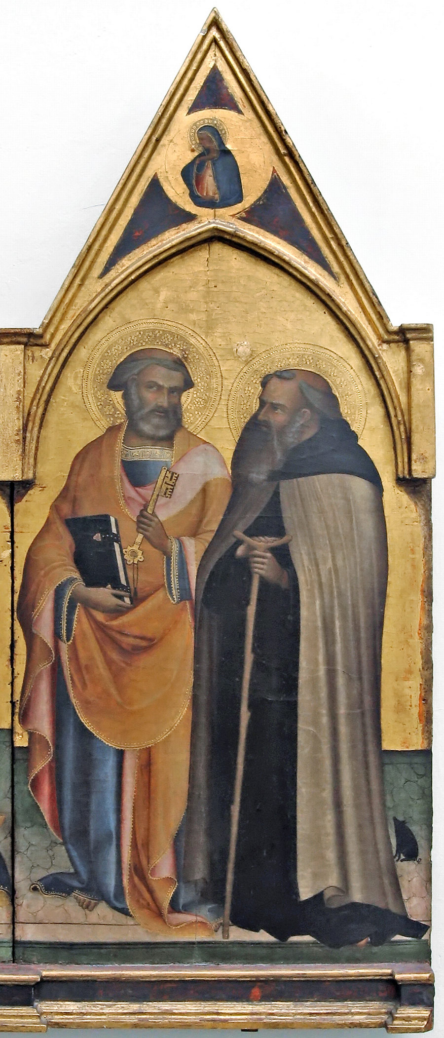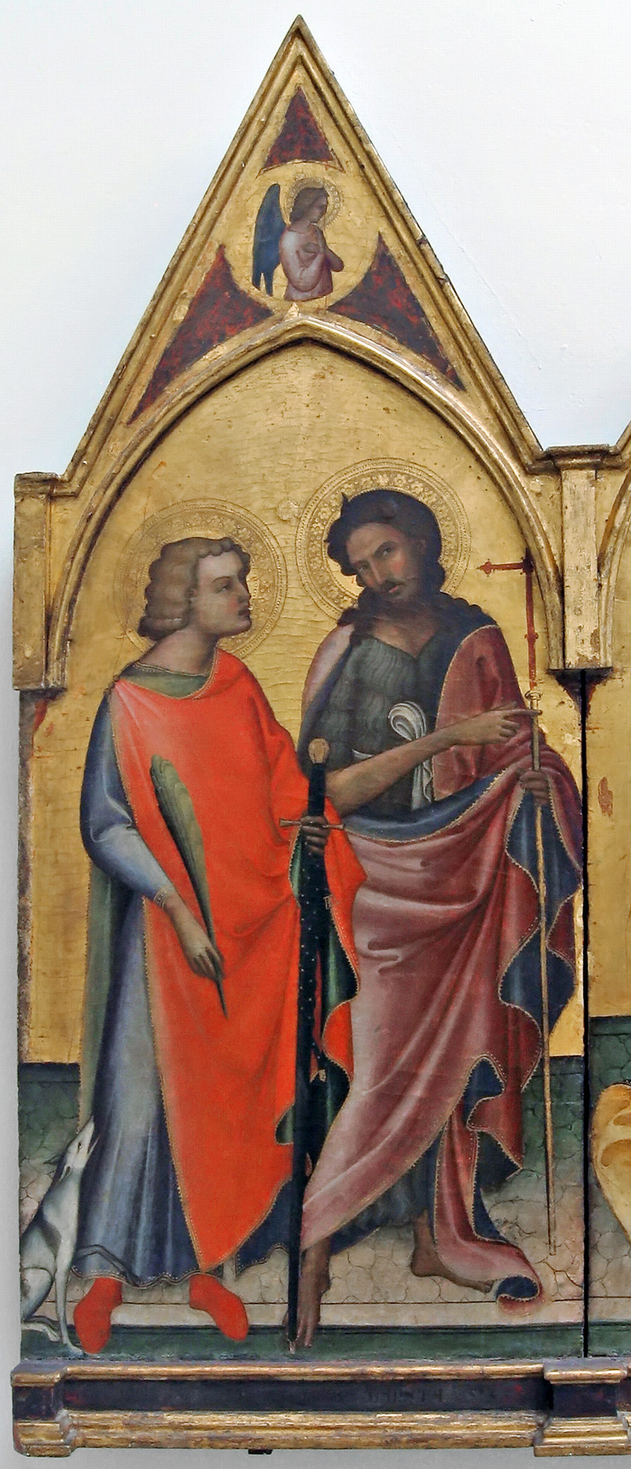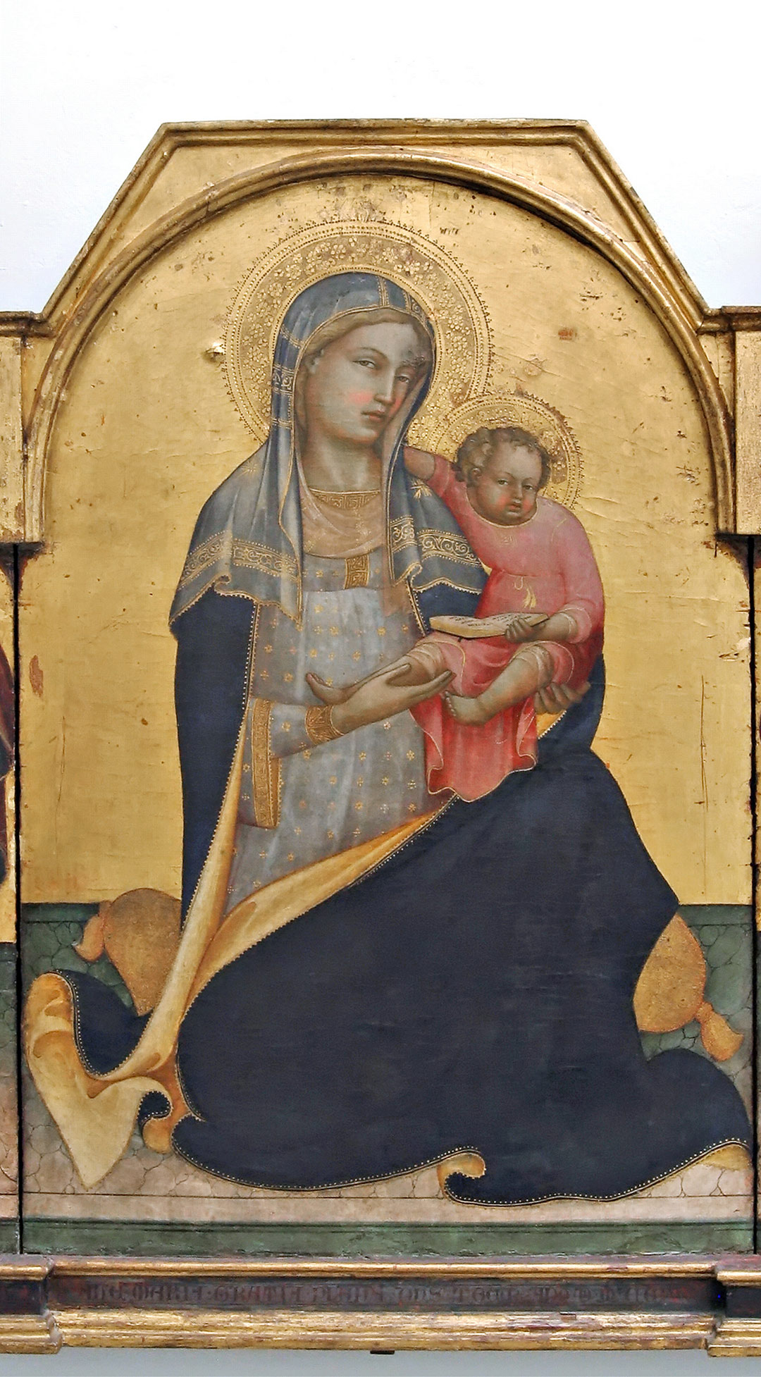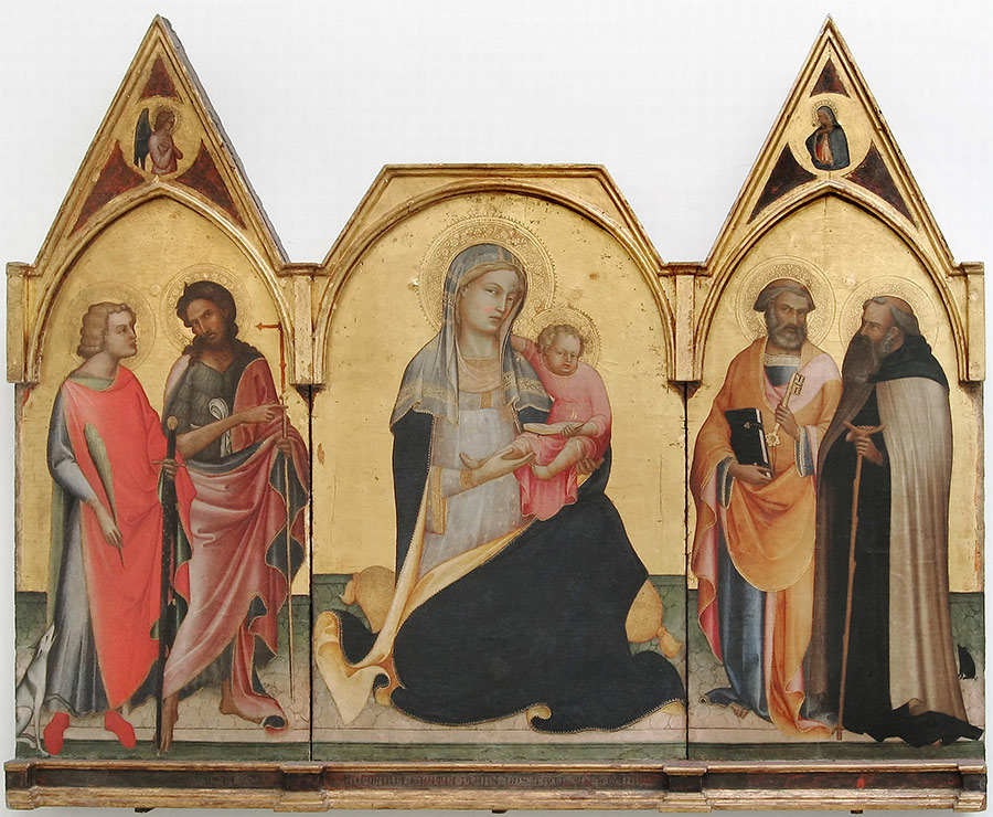 Iscrizioni: AVE.MARIA.GRATIA PLENA.DNS.TECUM.ANO.DI.MCCCCIIII (alla base del pannello centrale); S.DOMNINUS.M / S.IONES.BAPTSTA (alla base del pannello laterale sinistro); S.PETRUA.APOSTOLUS / S.AMTONIUS.ABB (alla base del pannello laterale destro)