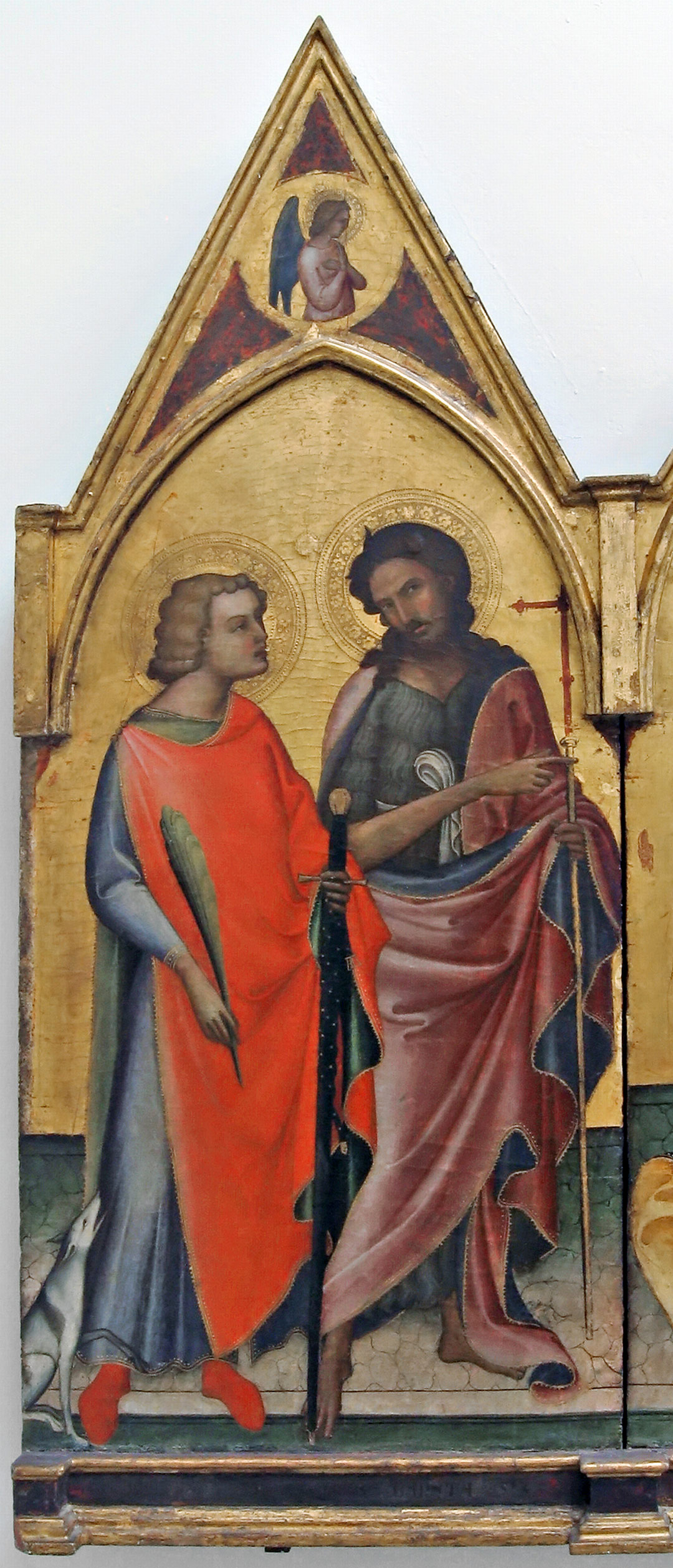 La falcata diagonale del manto che avvolge la slanciata figura di san Giovanni e che ricade frastagliato a terra, l’andamento tortuoso del manto di Maria richiamano i personaggi delle formelle del Ghiberti mentre la gamma cromatica scelta e vivace e soprattutto lo scatto del bimbo che pare colto nella flagranza del movimento, sono eco della lezione dello Starnina, e dunque delle istanze di gusto internazionale.