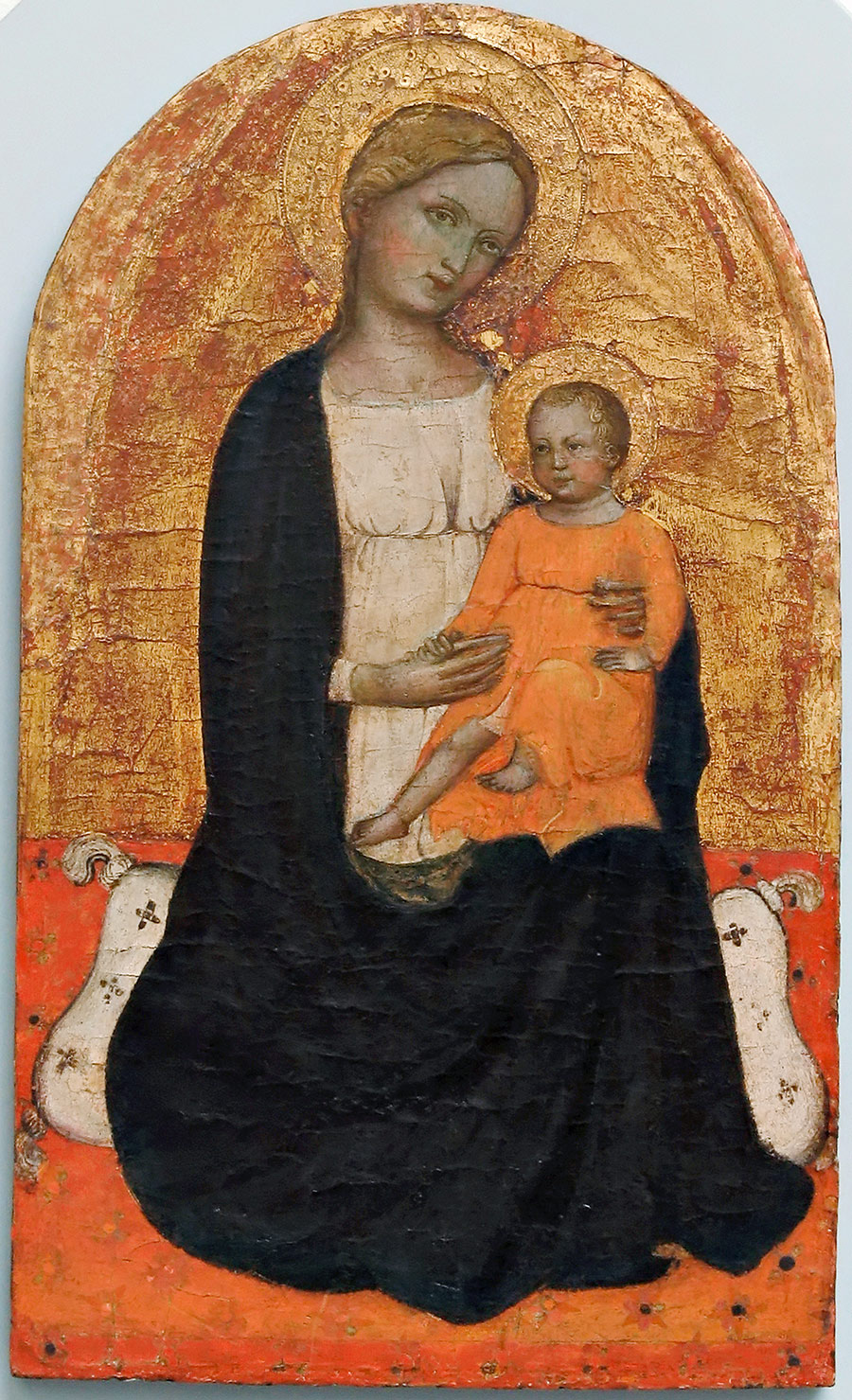 La tavoletta, di cui non si conosce la provenienza entrò in Pinacoteca nel 1956. Purtroppo la superfice pittorica si presenta segnata da antiche e devastanti puliture. lo stato di conservazione non consente di valutare la qualità del dipinto, che non doveva essere mediocre, a giudicare dal modellato del Bambino che occupa con grazia il grembo della madre.