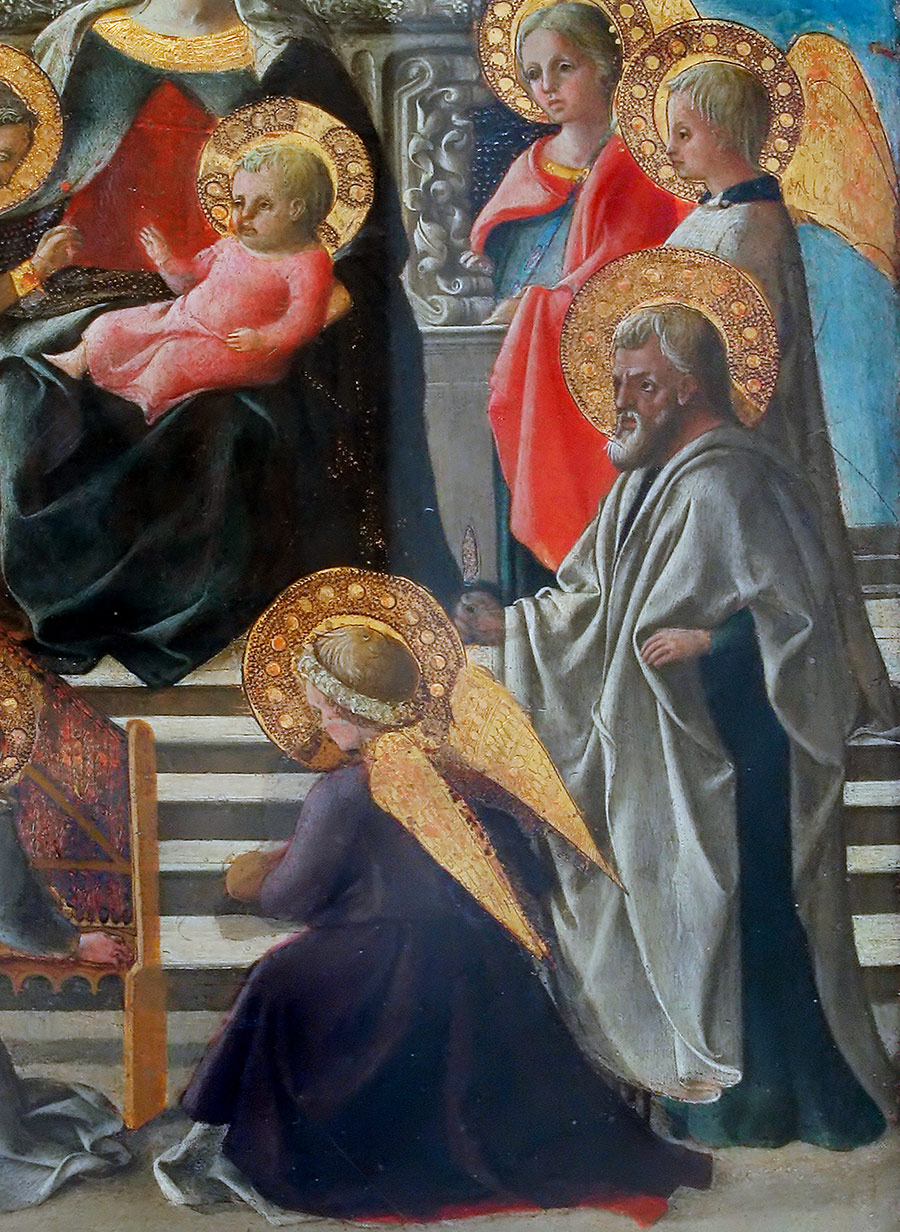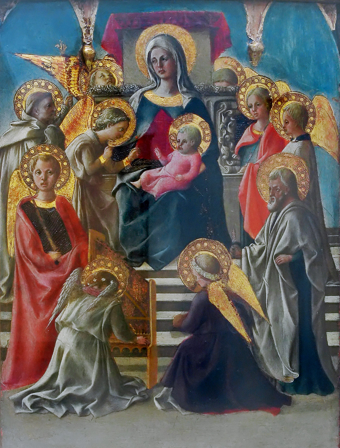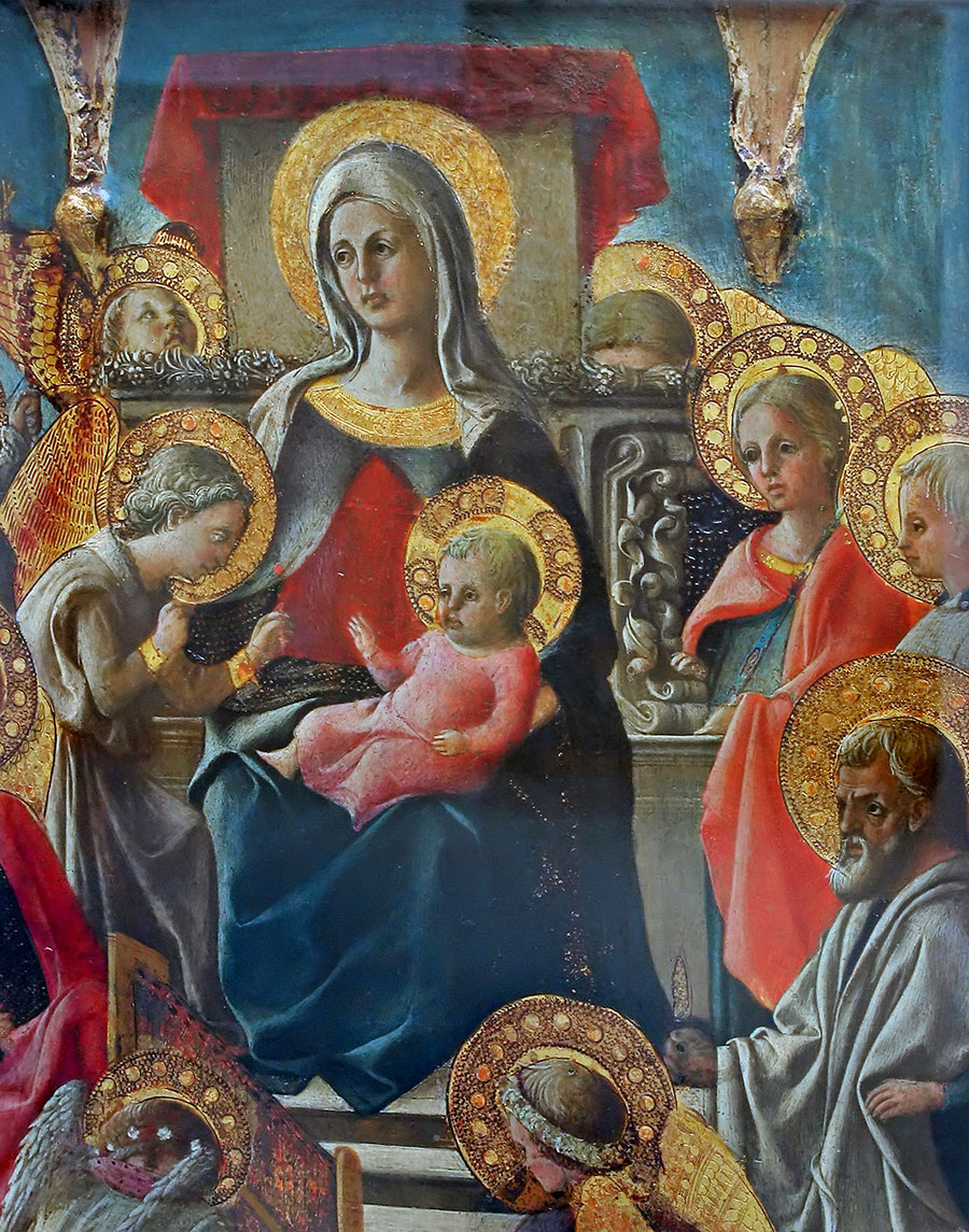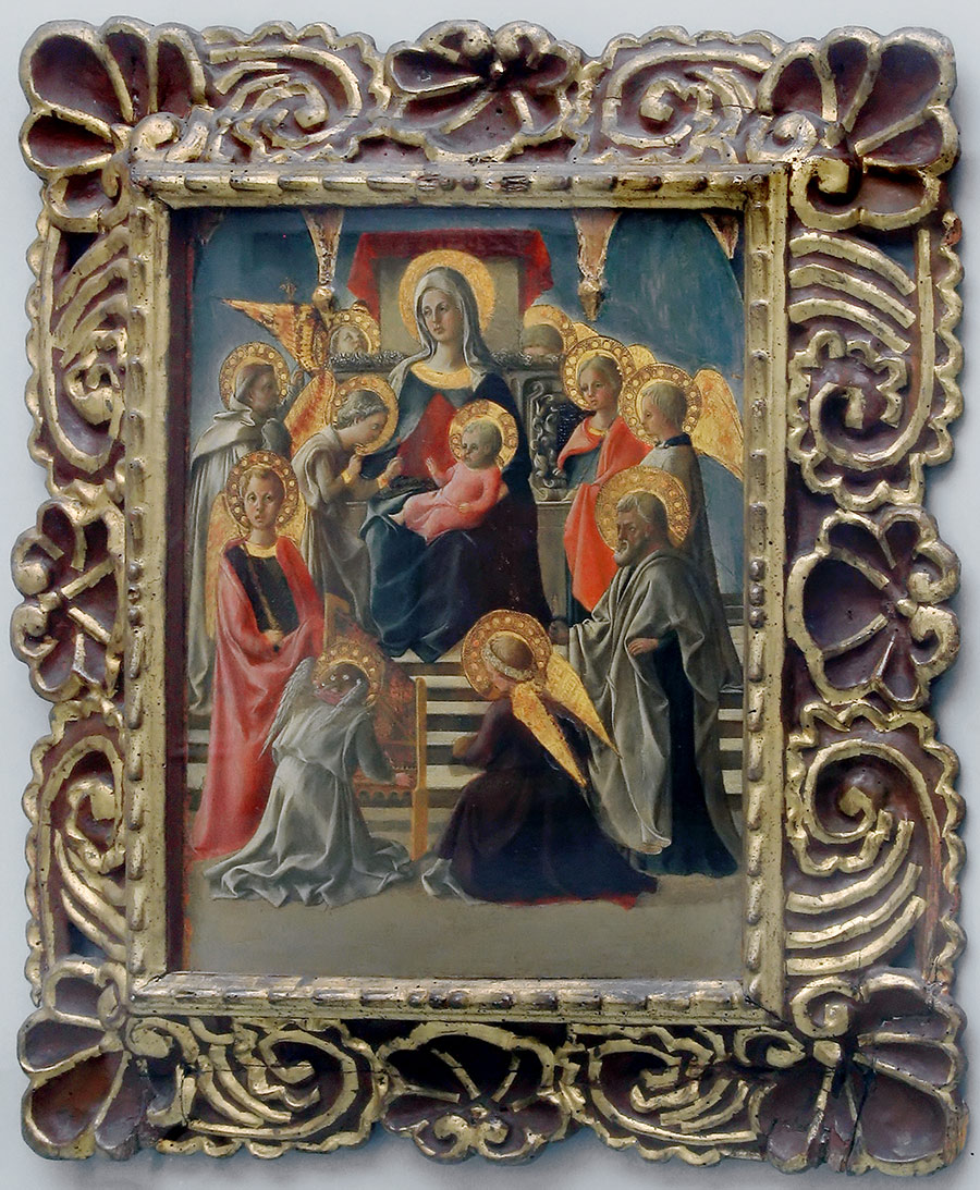 Al di sotto della cornice attuale, forse seicentesca, si intravedono i segni dell’originaria struttura trilobata ad archetti che doveva racchiudere la pittura e che fu asportata determinando il taglio della parte superiore. La presenza di Alberto Siculo da Trapani, in veste bianca e con il giglio in mano, in alto a sinistra, fa ritenere che l’opera abbia una committenza carmelitana riconducibile al monaco Bartolomeo Ulivieri che figura nei documenti riguardanti il Polittico di Pisa, dipinto da Masaccio nel 1426, opera nella quale è stato riconosciuto l’esordio del giovane Filippo. Vasari ricorda che Filippo Lippi già nel 1425 si esercitava quotidianamente sui muri della Brancacci e questo gli consentì già l’anno successivo di collaborare col maestro nel polittico pisano e di ricordare le soluzioni lì adottate dal maestro quando, qualche anno più tardi, dipinse la tavoletta di Empoli. Tali scelte sono qui riecheggiate nella disposizione prospettica delle figure raccolte intorno al trono della Vergine e scalate sfruttando la gradinata; nei due angeli ai piedi di quest’ultima còlti in un arditissimo scorcio, oltre che la solida costruzione dei volumi. Il dipinto è stato eseguito per una visione lenta e ravvicinata, in modo da poter gustare, oltre al mirabile equilibrio delle parti, tutta una serie di sottigliezze esecutive – l’uso degli ori per le aureole e le ali angeliche e il raffinato disegno a fogliami del trono – degne della migliore tradizione pittorica fiorentina. Spiccatamente lippesca è la varietà espressiva dei personaggi che varia dalla gravitas masaccesca di san Bartolomeo, alla devota meditazione di sant’Alberto, fino a comprendere anche un guizzo umoristico nei due angeli ai lati del trono, uno con lo sguardo all’insù, verso il cielo, l’altro con la faccia tuffata tra le sue cose.