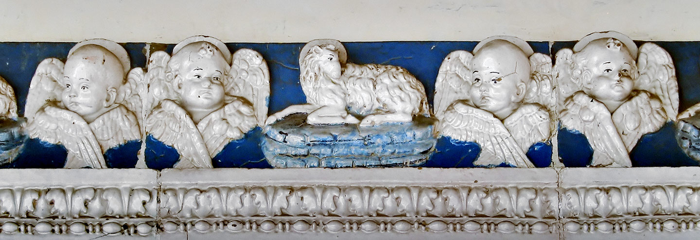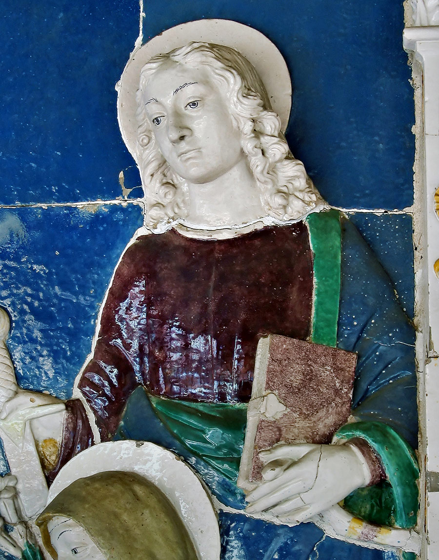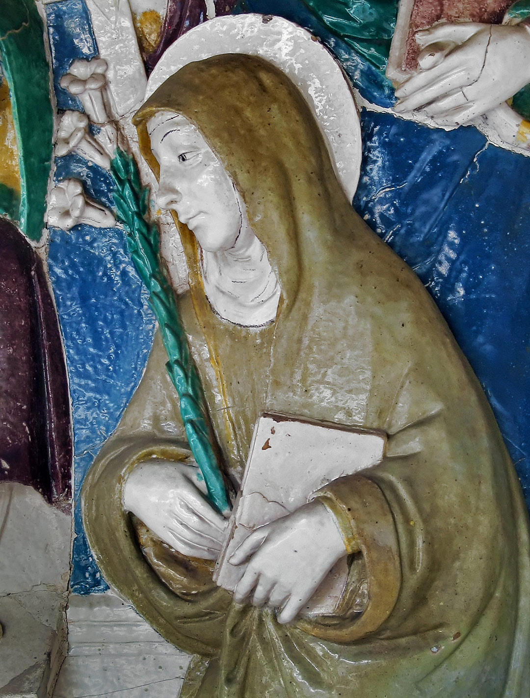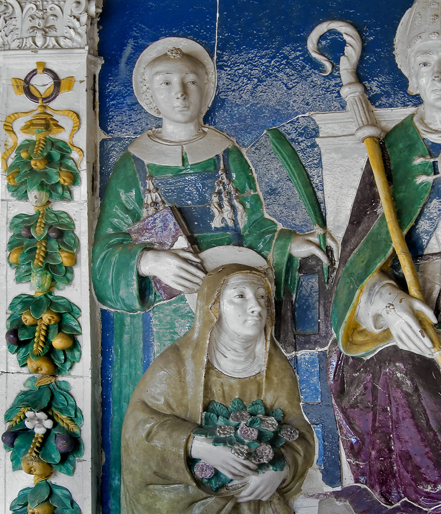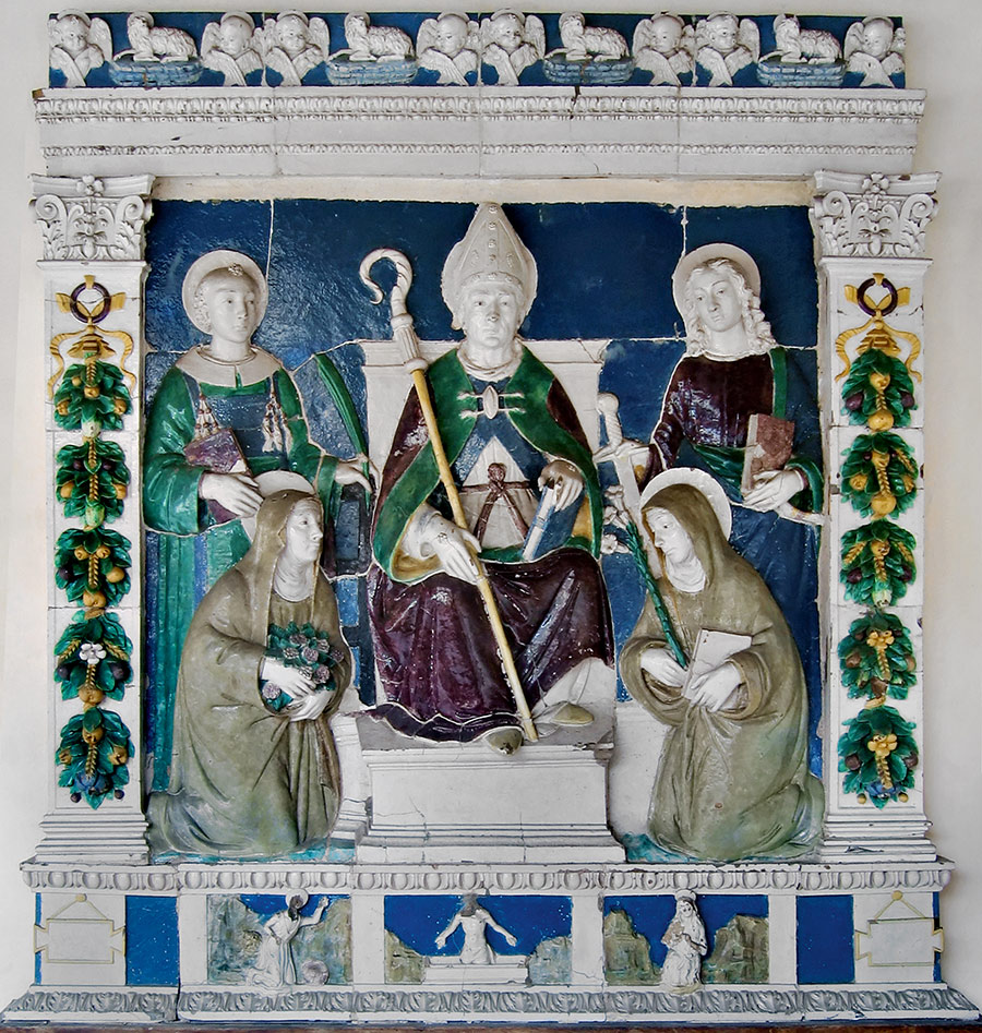 La terracotta era posta a pendant dell’Immacolata Concezione nella chiesa francescana di Santa Maria a Ripa: entrambe erano collocate alla fine del secolo XIX nella cappella intitolata a sant’Anna e da lì furono trasferite nel Museo della Collegiata. È una delle più antiche rappresentazioni del vescovo Anselmo II di Lucca, vissuto nell’XI secolo e canonizzato nel secolo successivo. Benché non francescano, Anselmo era figura assai venerata in seno all’Ordine: questo ne giustifica la presenza, fra gli altri padri della chiesa, nelle terrecotte empolesi. Oltre alle due sante francescane appaiono poi san Giuliano ospedaliere, esempio di carità verso gli infermi, e san Lorenzo diacono, cui era intitolata una delle chiese abbattute per la costruzione di Santa Maria. Nella predella i santi Girolamo e Maria Egiziaca sintetizzano il concetto della penitenza e della rinunzia ai beni terreni.