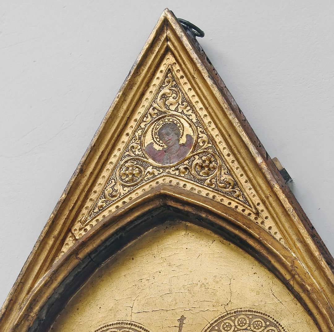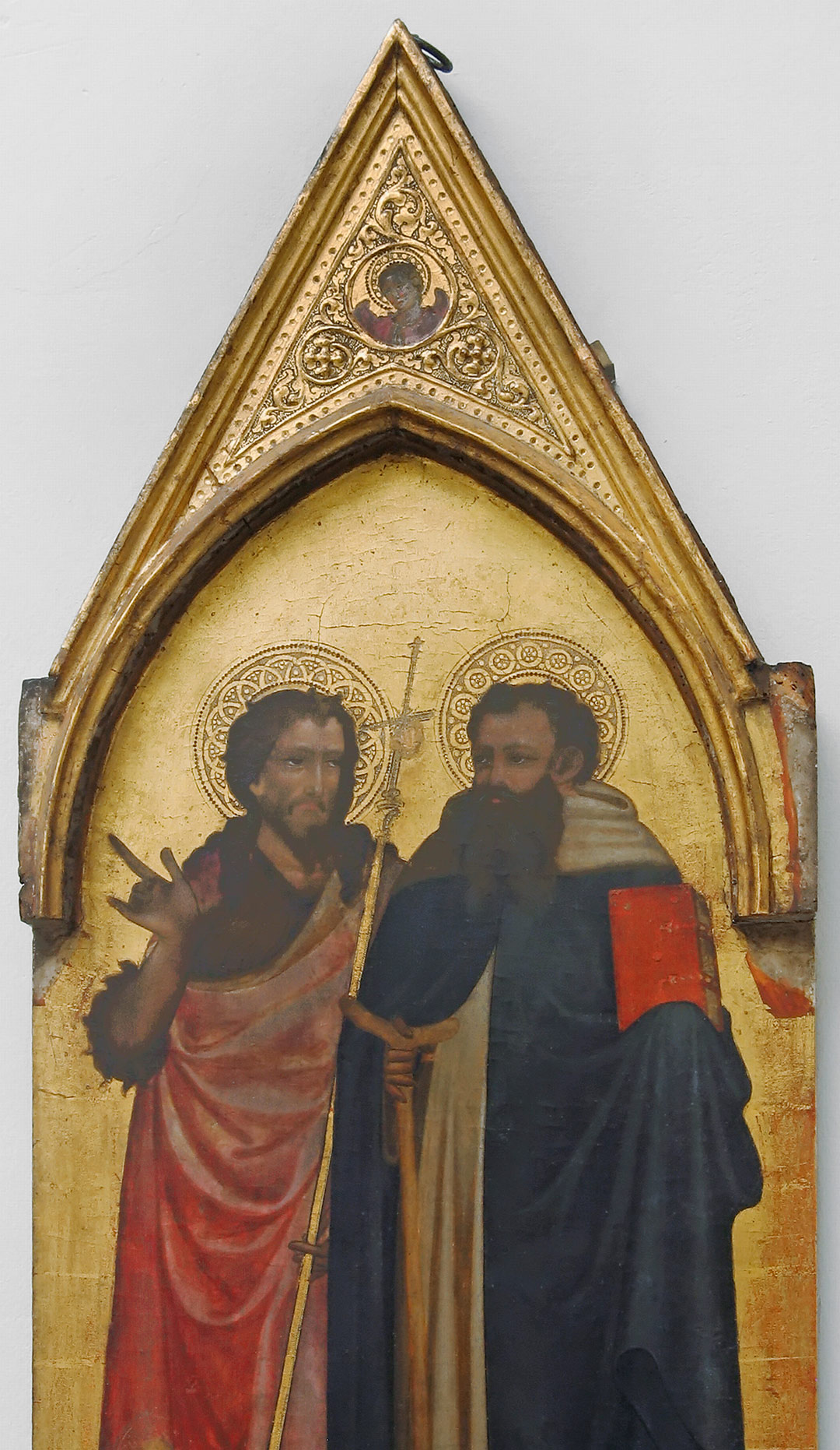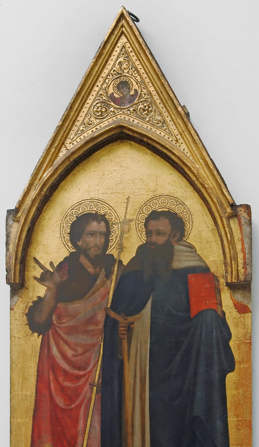 I due pannelli cuspidati mancati della tavola centrale figurano tra le prime opere giunte in Pinacoteca e furono eseguite da Scolaio di Giovanni, uno degli «sventati calligrafi» rimasti impermeabili, tranne per alcune riprese superficiali, alle novità rinascimentali e fedele imitatore dei modi dello Starnina.