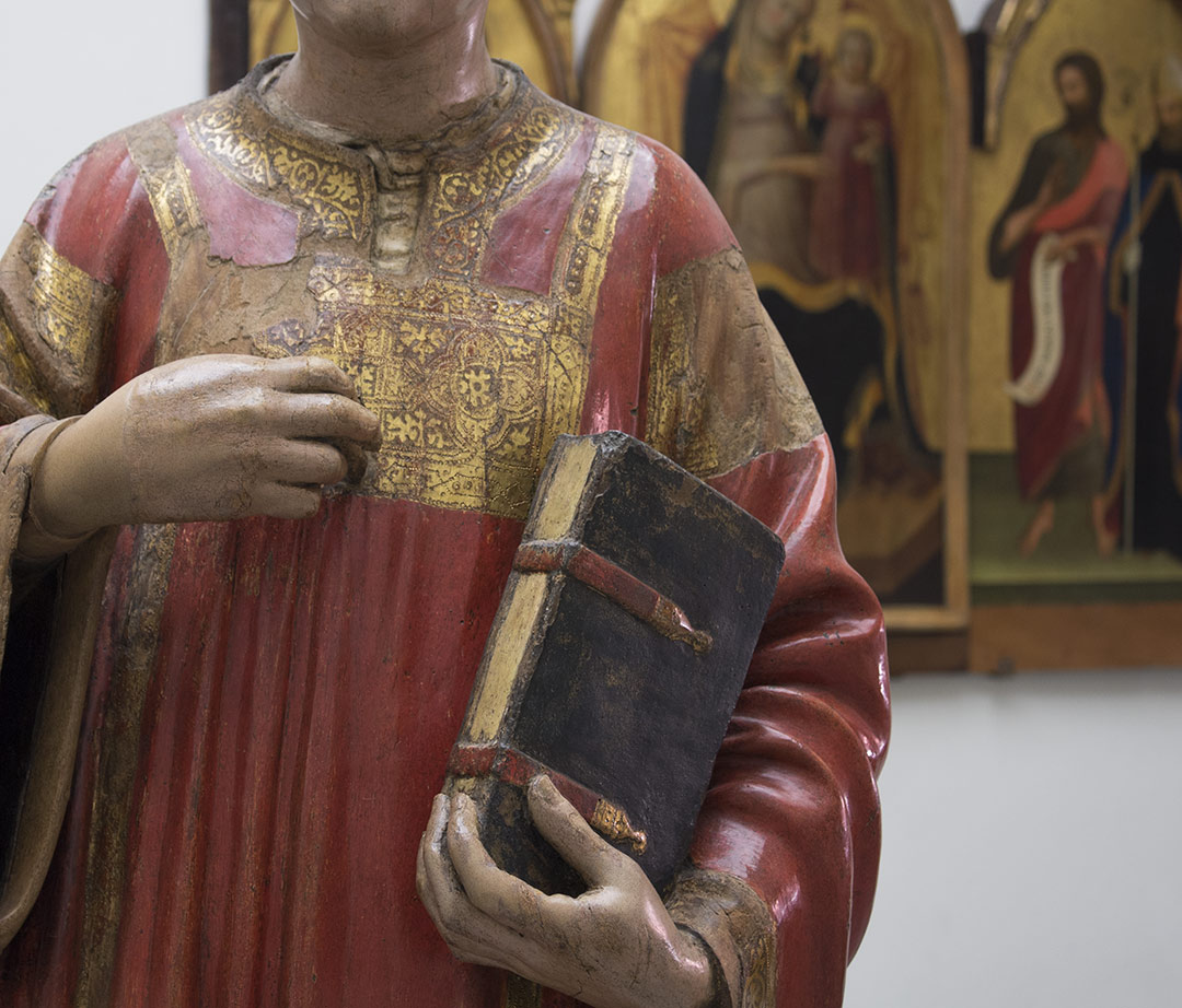 L’opera, nel corso dei secoli, ha cambiato più volte collocazione, fino ad approdare di nuovo nella Collegiata di Sant’Andrea e nello specifico nella «corsia di San Giovanni» dove viene ricordata in un inventario databile tra la fine del Settecento e i primi anni dell’Ottocento. L’opera risultava ricoperta da uno strato di colore bianco, a imitazione del marmo, che è stato rimosso nel 1935 e ha consentito di recuperare pienamente la policromia della veste e del volto. Il restauro terminato nel 2012 ha definitivamente messo in luce l’abilità tecnica, l’utilizzo di colori preziosissimi e l’impiego, senza risparmio, dell’oro. Questi aspetti hanno indotto a ipotizzare una facoltosa committenza, riconducibile probabilmente al prelato Giovanni di Piero Bitteri di Francia, cappellano onorario di papa Bonifacio IX e rettore della cappella di San Lorenzo agli inizi del Quattrocento. L’origine francese di quest’ultimo lascia immaginare che avesse individuato nel Valdambrino un artefice capace di interpretare il suo gusto raffinato.
