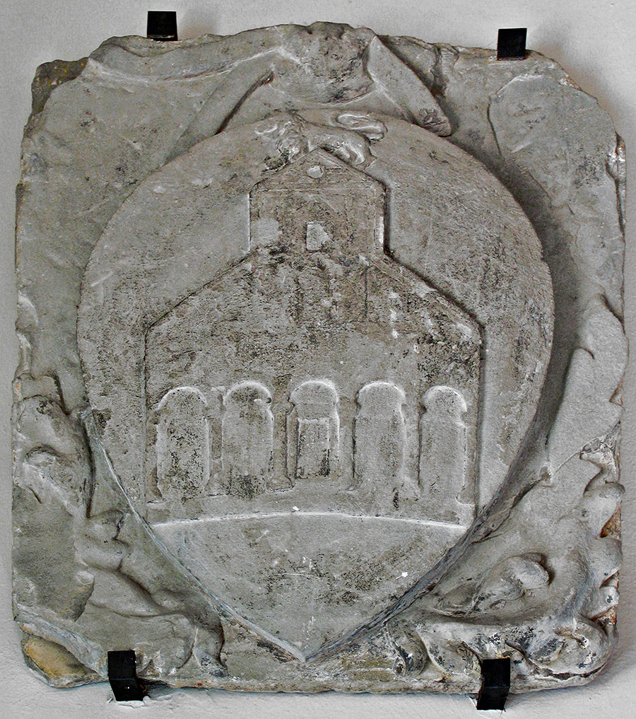 Posto in origine nell’intradosso dell’arco nel passaggio tra la Collegiata e il Battistero, l’arme fu trasferita nel Museo durante i lavori di risistemazione successivi ai bombardamenti dell’ultima guerra.