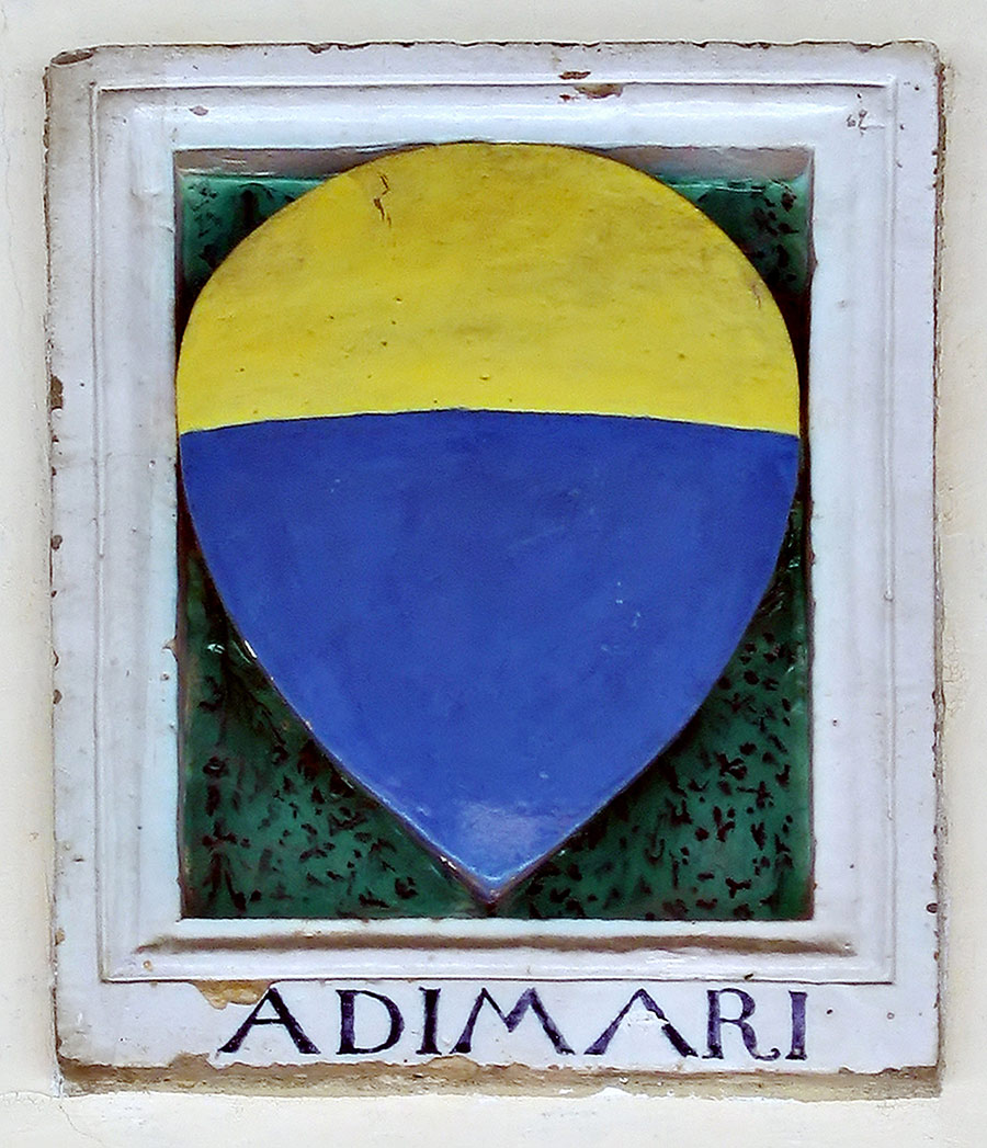 Entro una formella rettangolare, dalla semplice cornice modanata, bianca è posto, su di un fondo di color verde con tocchi di nero, lo scudo a goccia con l’arme della famiglia Adimari, di cui si legge il nome nel bordo inferiore della cornice.