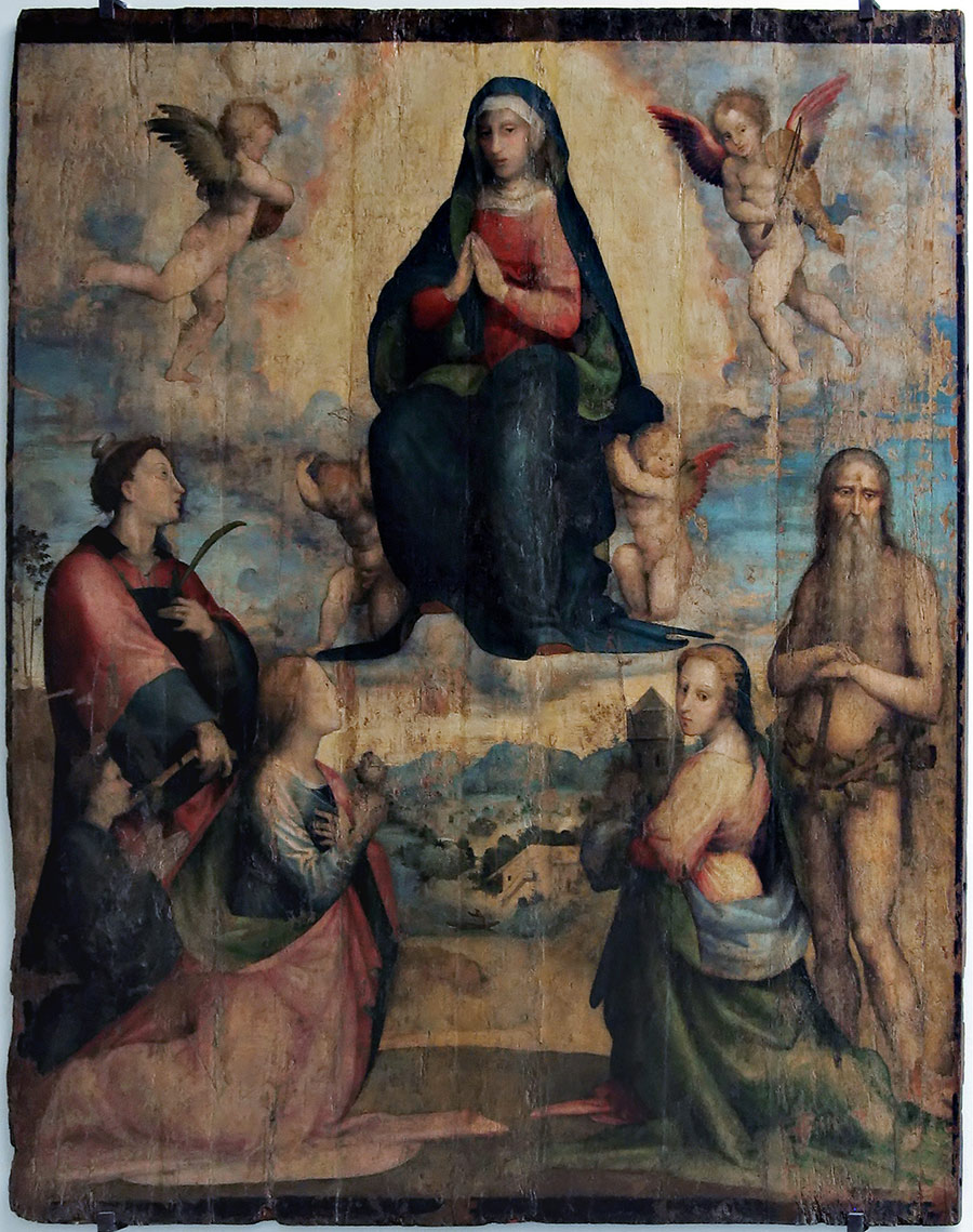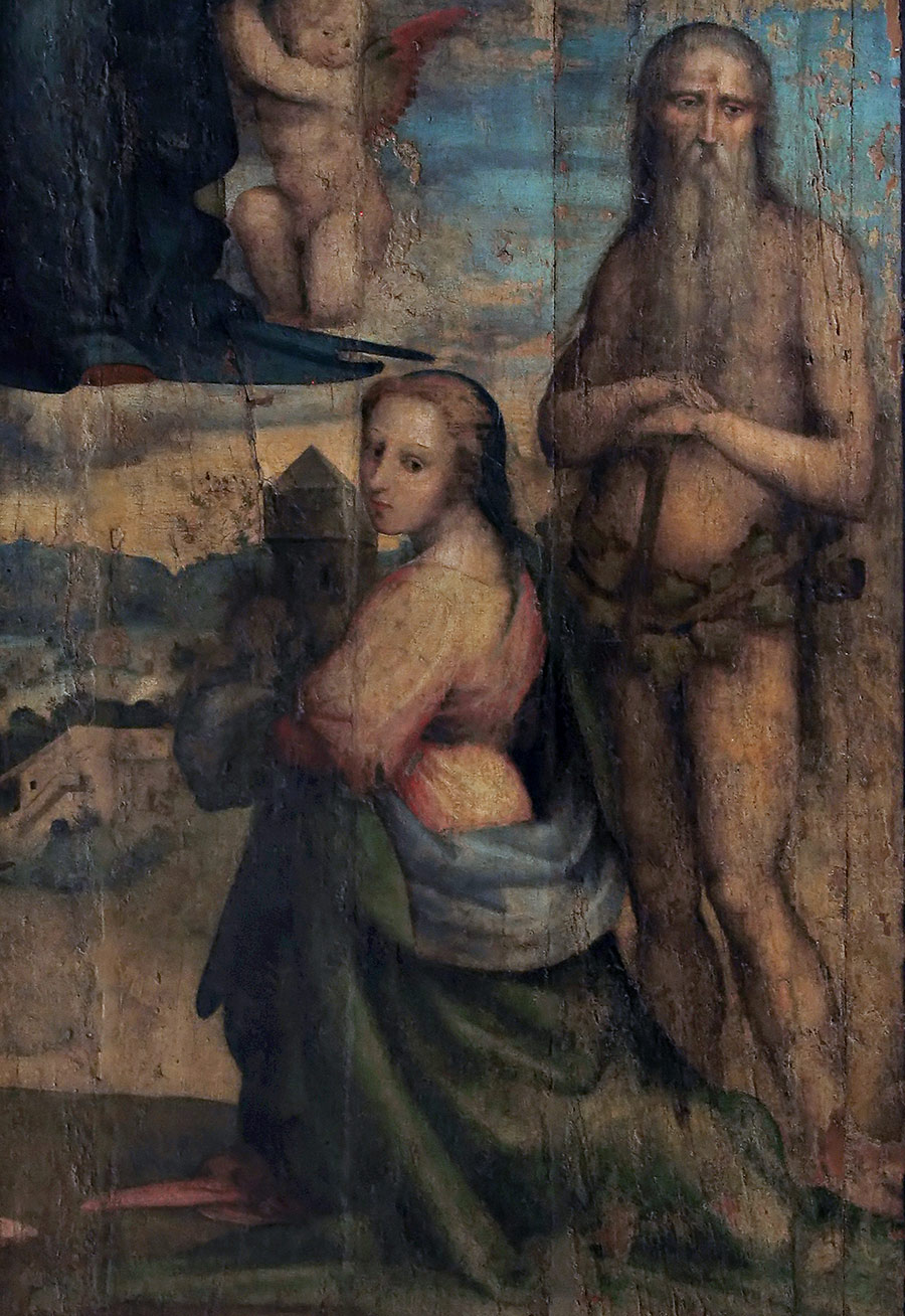 Il dipinto proviene dalla Cappella dedicata ai santi Stefano e Noferi in Collegiata, di patronato Ronconcelli. La tavola, pur essendo assai rovinata, risulta tra le più felici di questo artista, attivo perlopiù in terre di provincia. L’opera restituisce tratti di estrema gradevolezza soprattutto nel paesaggio da favola, dipinto nei toni dell’ocra e del turchino, che si ritaglia tra i santi dalla fattura in realtà un po’ approssimata. La fattura stenta e le forme talora incerte dei personaggi lasciano spazio a una leggera indagine psicologica che traspare dal volto della Vergine e di Stefano, sulla cui testa è appoggiata, in equilibrio improbabile, la pietra del martirio. Sfuggente nei contorni, secondo i modi dello Scalabrino, è il volto di Maddalena mentre, perplessa, appare santa Barbara, chiamata a reggere l’impegnativo peso della torre. Con posa ancheggiante, a segnare il tradizionale attributo del perizoma di foglie, si staglia, sulla destra del riguardante, Onofrio.