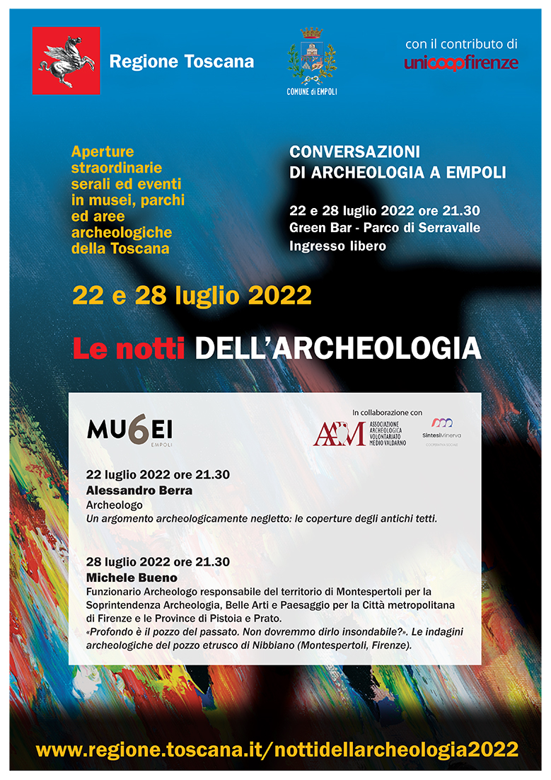 Due date dedicate alle Conversazioni di Archeologia a Empoli, in collaborazione con Associazione archeologica Medio Valdarno e cooperativa sociale SintesiMinerva onlus, in occasione de Le Notti dell’Archeologia 2022, a cura della Regione Toscana: il progetto, alla ventiduesima edizione, prevede aperture straordinarie serali ed eventi in musei, parchi e aree archeologiche della Toscana.